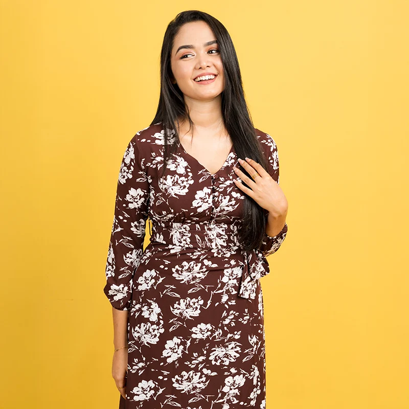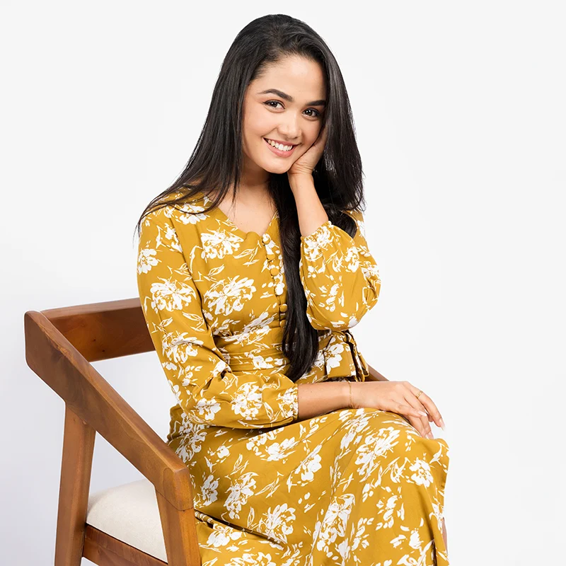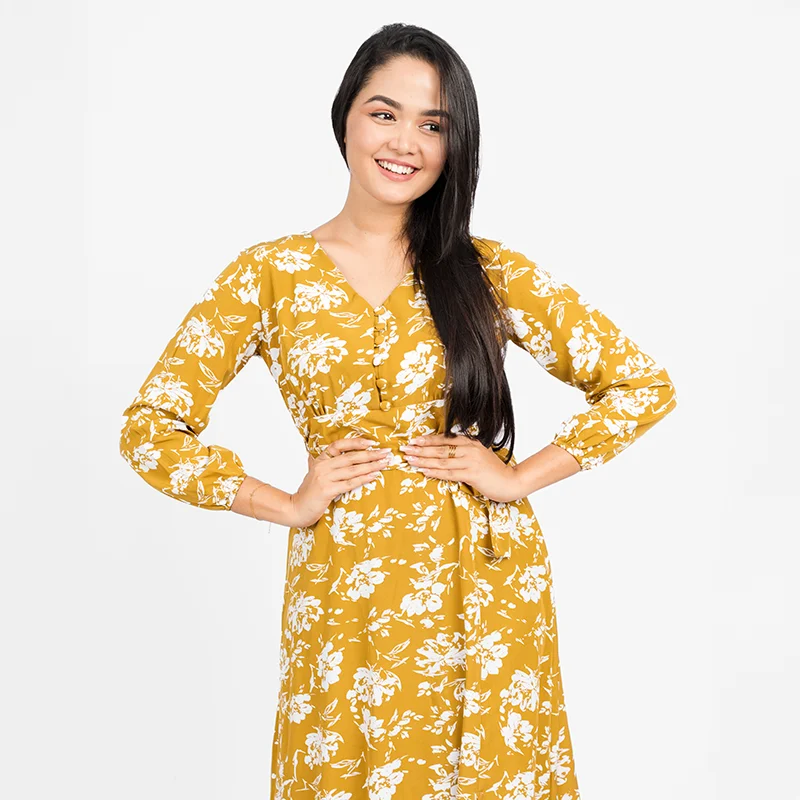 Made from premium maza fabric, this dress provides a soft, breathable feel ideal for all-day wear. The lightweight yet structured texture maintains its flowy form, while remaining easy to move in. Its smooth surface ensures a polished appearance with minimal effort, making it suitable for a variety of occasions.