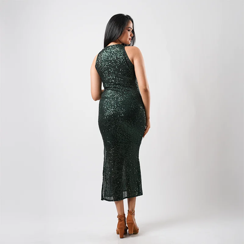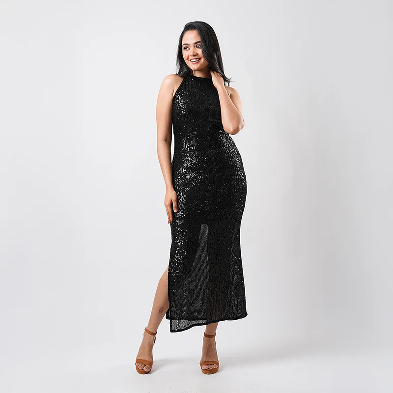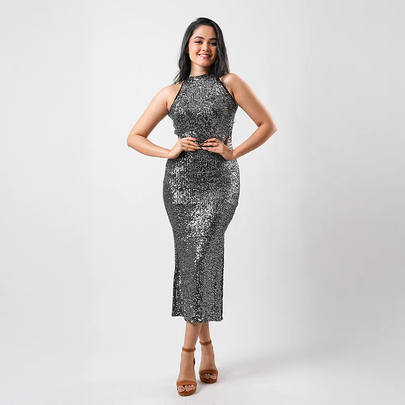 Crafted with premium sequin material, this dress delivers a radiant finish with subtle texture and structured drape. The surface catches the light beautifully, enhancing movement while maintaining a smooth, flattering fit.