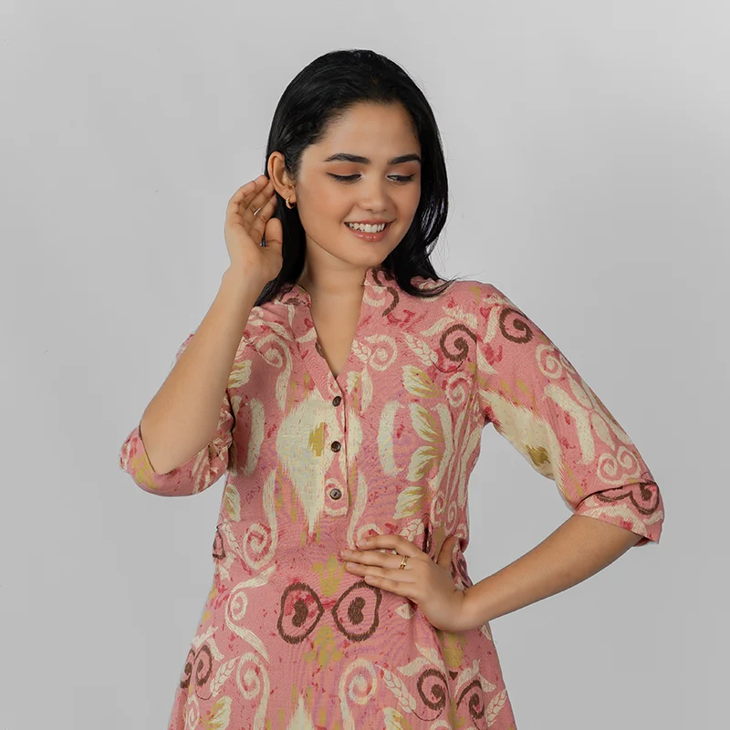 Exude effortless sophistication in this beautifully crafted midi dress that balances comfort with understated elegance. Featuring a refined V-neckline, half sleeves, and a gently flared silhouette, it flatters every figure while offering a relaxed, easy-to-wear fit. The striking Ikat-inspired pattern lends a touch of artisanal charm, perfect for adding character to your everyday style.