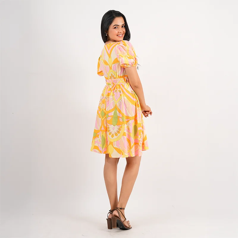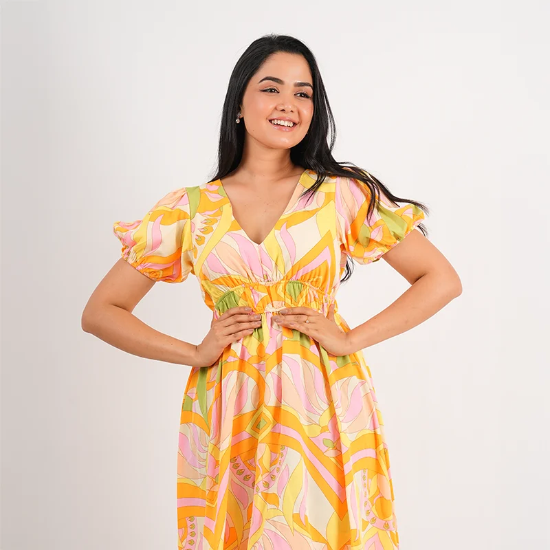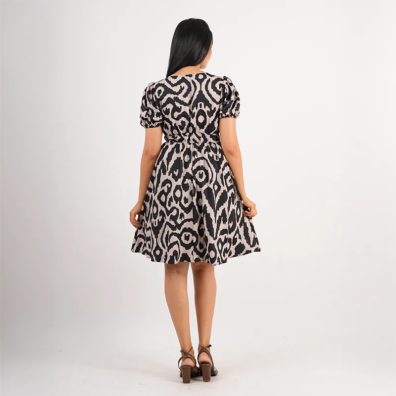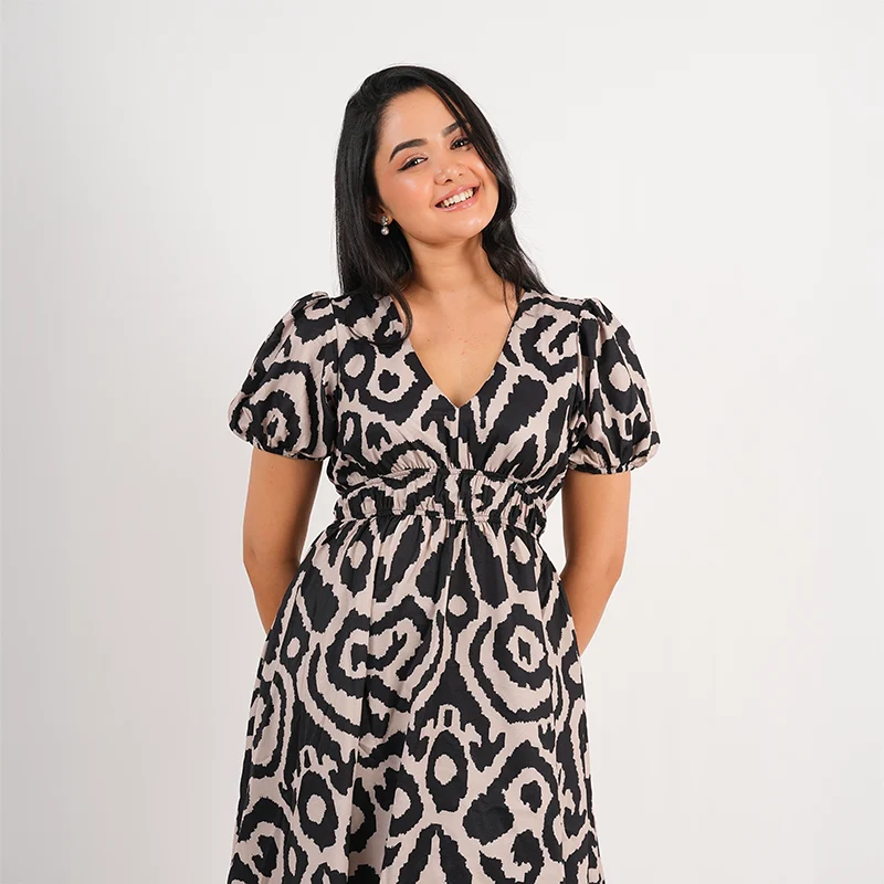 Step into effortless charm with this beautifully structured flare dress designed to combine comfort with modern elegance. Featuring a flattering V-neckline and softly puffed sleeves, the fitted waistline gently shapes the silhouette before flowing into a graceful flared skirt that adds movement and playful femininity. The balanced design creates a timeless look that feels both chic and easy to wear.
