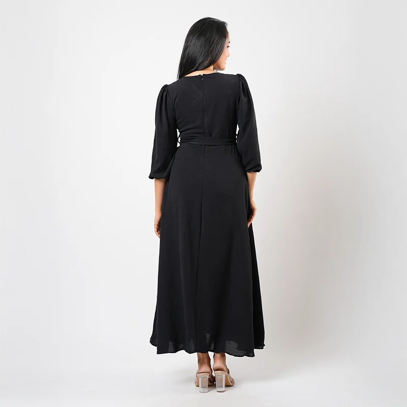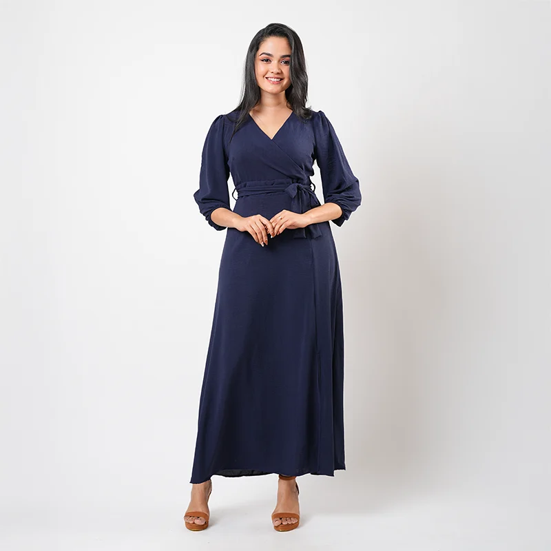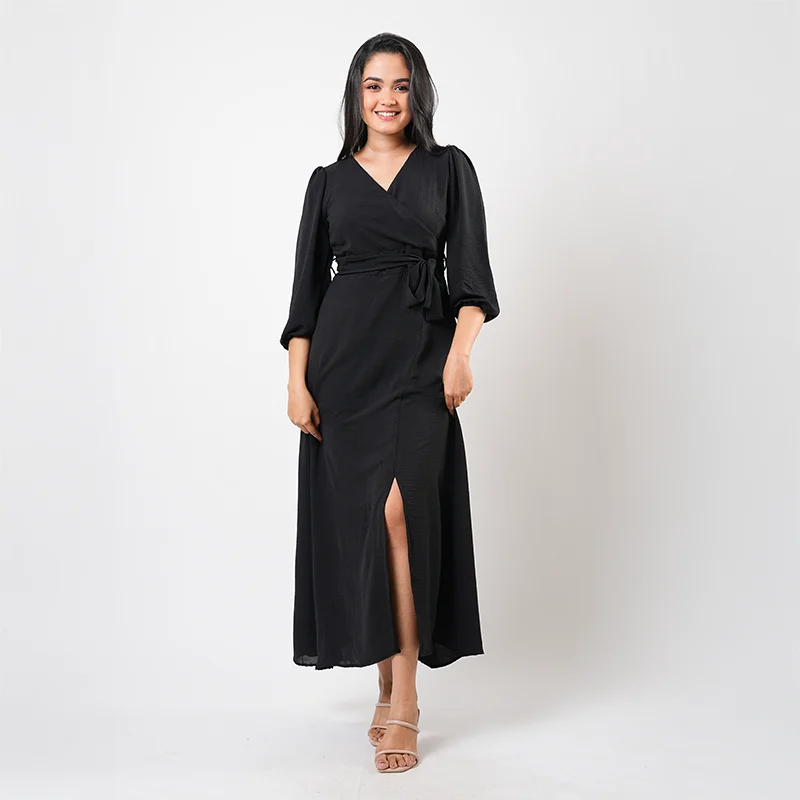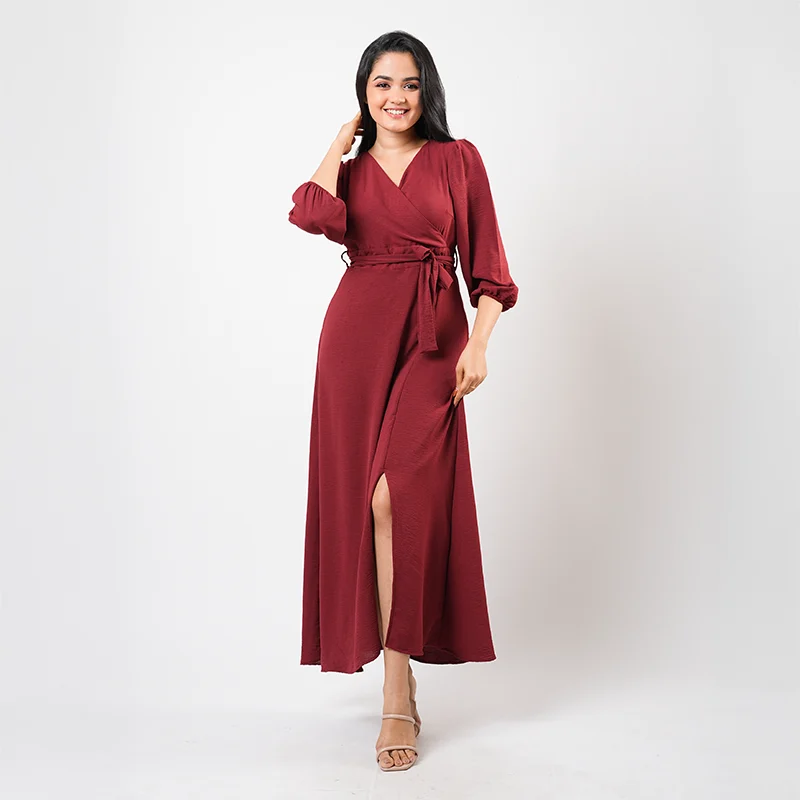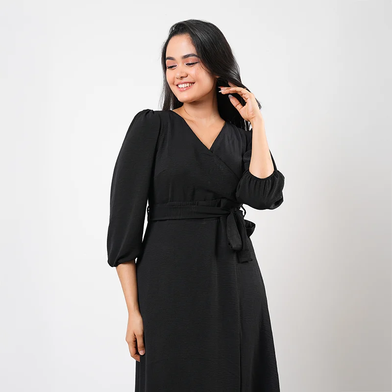 Step into effortless sophistication with this elegant wrap-style midi dress. Designed with a flattering V-neckline and softly gathered long sleeves, the silhouette drapes beautifully across the body. A self-tie waist detail enhances the shape, while the subtle front slit adds graceful movement and a touch of modern allure.