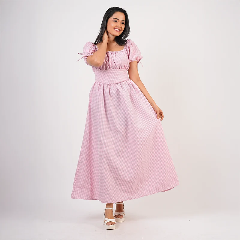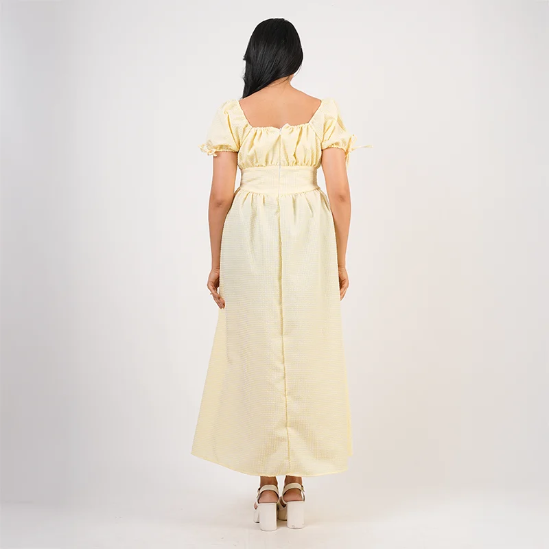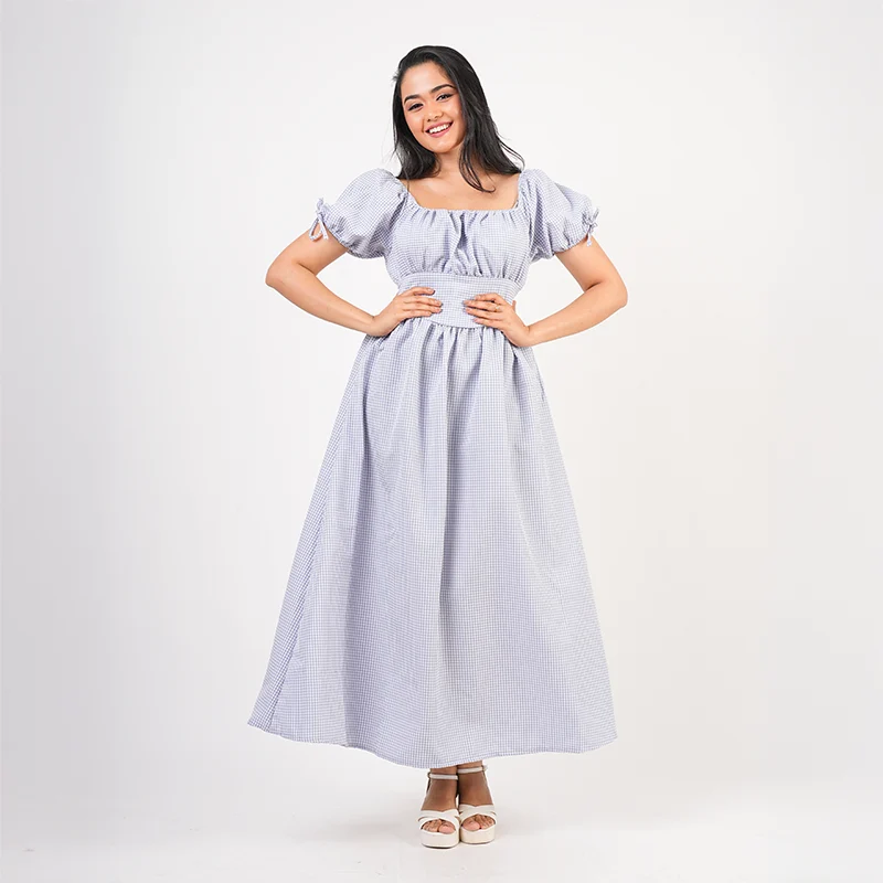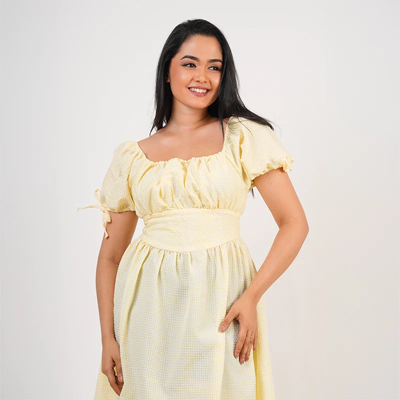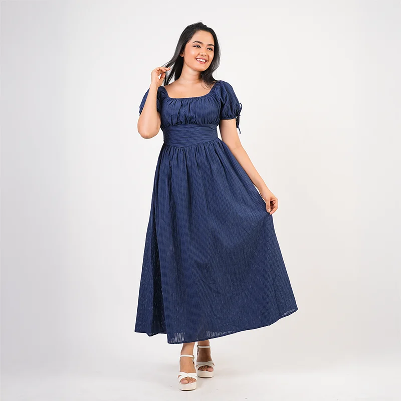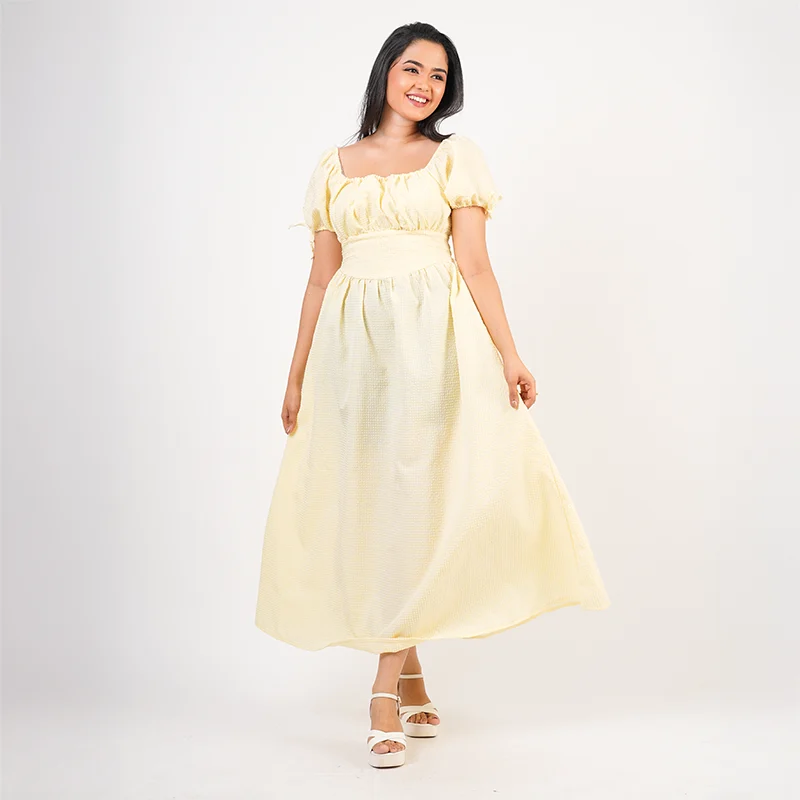 Step into effortless elegance with this beautifully balanced midi dress, designed to flatter with soft structure and graceful flow. Featuring a gently gathered square neckline and delicate puffed sleeves with subtle tie details, the dress cinches at the waist before falling into a fluid, full-length skirt. The silhouette offers a timeless charm that feels both feminine and relaxed.