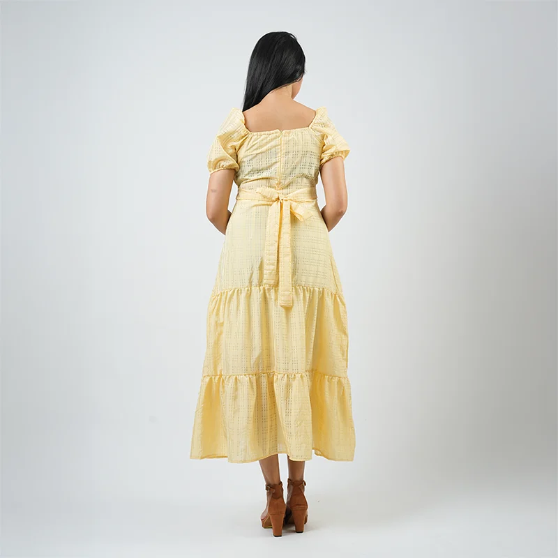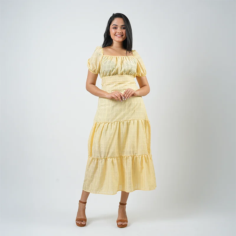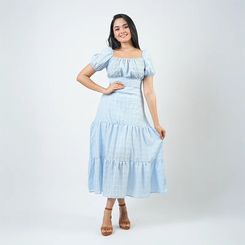 Effortlessly romantic, the Aurora Tiered Midi Dress brings a timeless feminine charm to your wardrobe. Designed with a flattering square neckline, softly gathered puff sleeves, and a smocked waist, it creates a graceful silhouette that enhances every movement. The tiered skirt adds a touch of flow and volume, making it perfect for days when comfort and style go hand in hand.