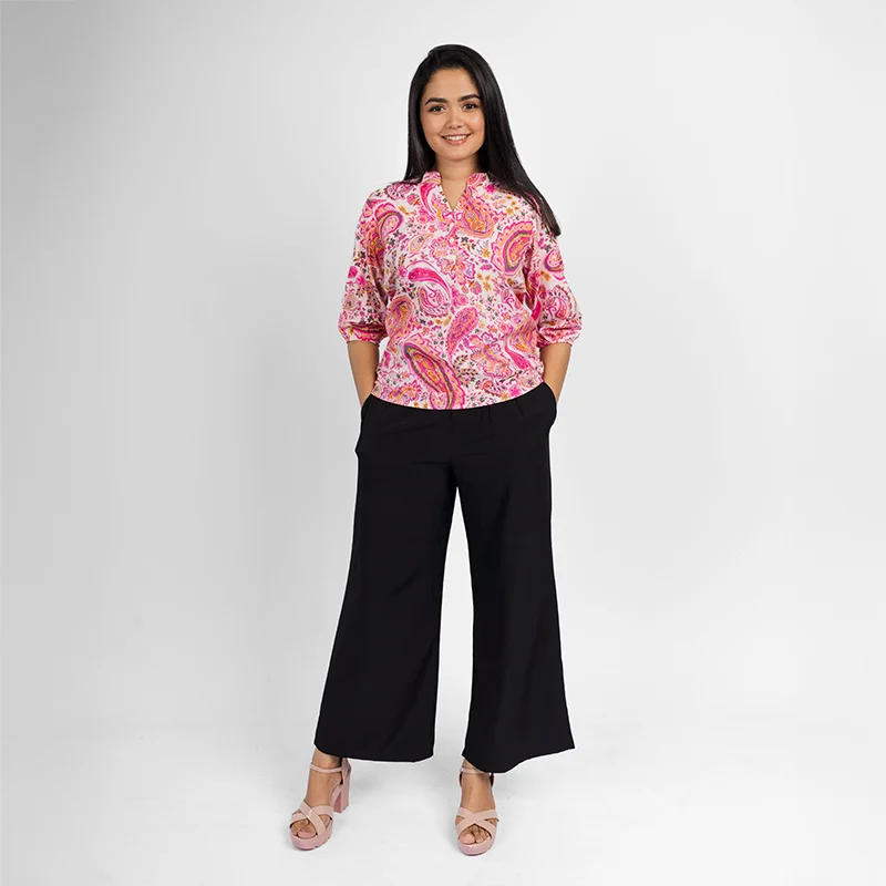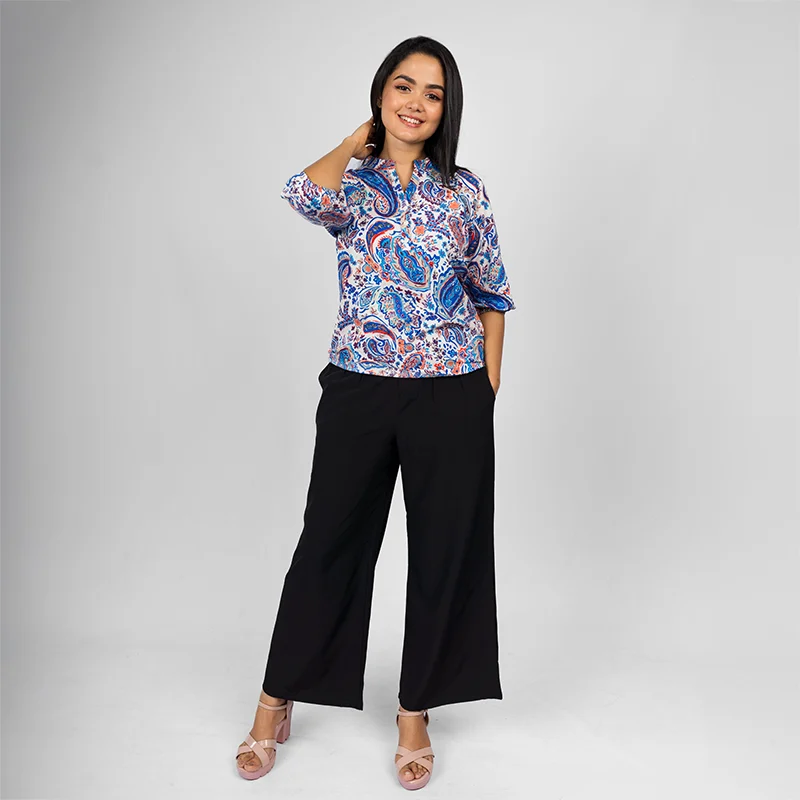 Infuse your everyday style with vibrant sophistication in this elegant tunic blouse. Designed with a mandarin collar, half button placket, and three-quarter sleeves with gentle gathers, it offers a blend of structure and flow for effortless grace. The intricate all-over paisley print adds a timeless artistic flair, making it a versatile piece that transitions seamlessly from work to weekend.