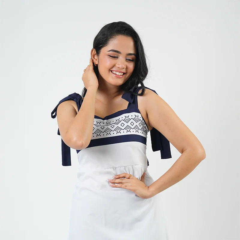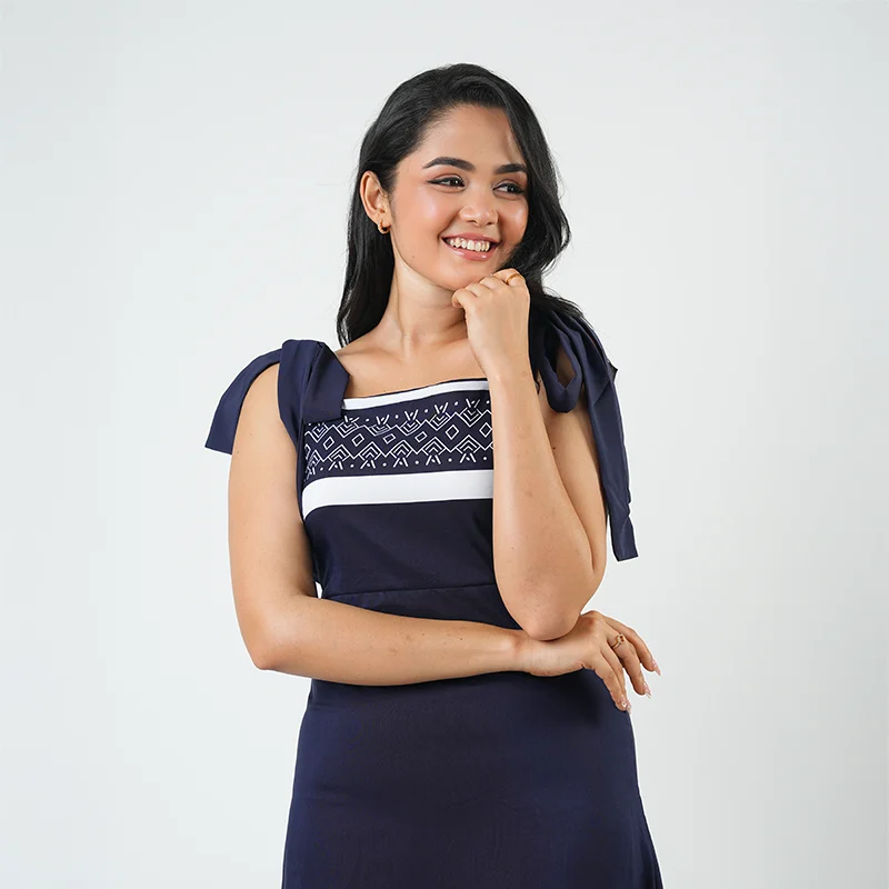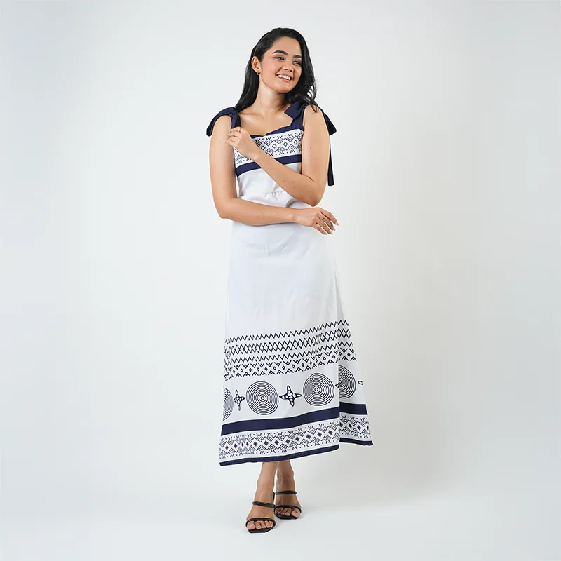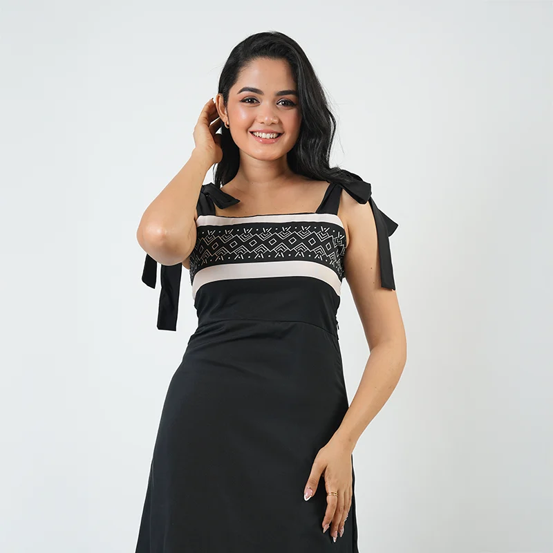 Chic and contemporary, this maxi dress brings effortless sophistication with its clean lines and graceful flow. The square neckline and charming tie-up shoulder straps add a playful touch, while the subtle border patterns along the hem create visual balance and modern elegance. Its flattering A-line silhouette ensures ease and comfort with every move.