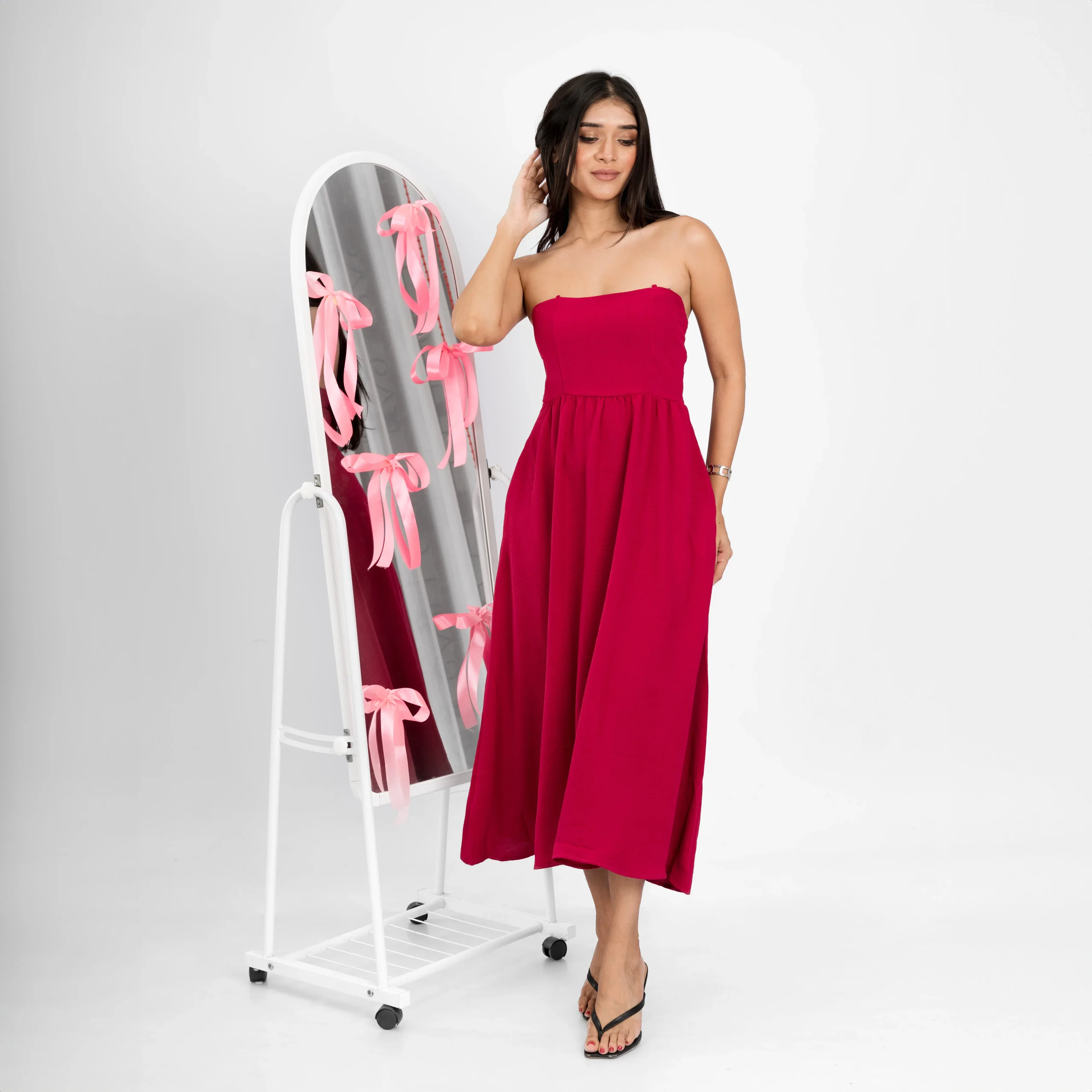 Embrace effortless sophistication with this stunning midi dress. Designed with a sleek, fitted bodice and a gently flared skirt, this dress offers a flattering silhouette that moves gracefully with every step. The structured yet flowy design creates a perfect balance of elegance and ease, making it a versatile piece for various occasions. Pair it with delicate heels or chic flats to complete the look.
