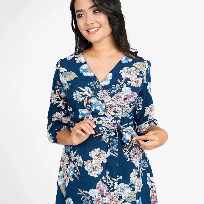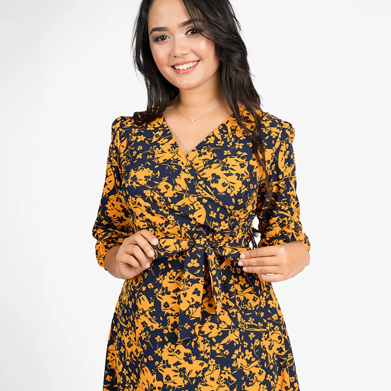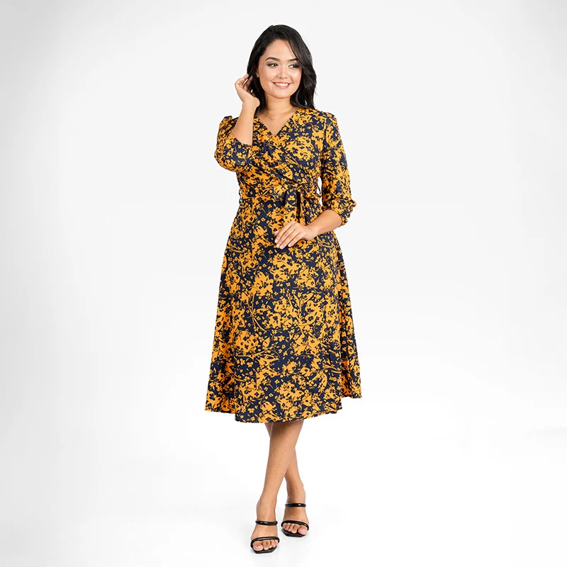 Effortlessly elegant and timeless, this wrap midi dress is designed to complement your silhouette with a flattering V-neckline and a delicate waist tie. The graceful wrap-style bodice adds a touch of sophistication, while the flowing skirt ensures ease of movement. Thoughtfully tailored three-quarter sleeves bring an air of refinement, making this dress a versatile choice for various occasions.