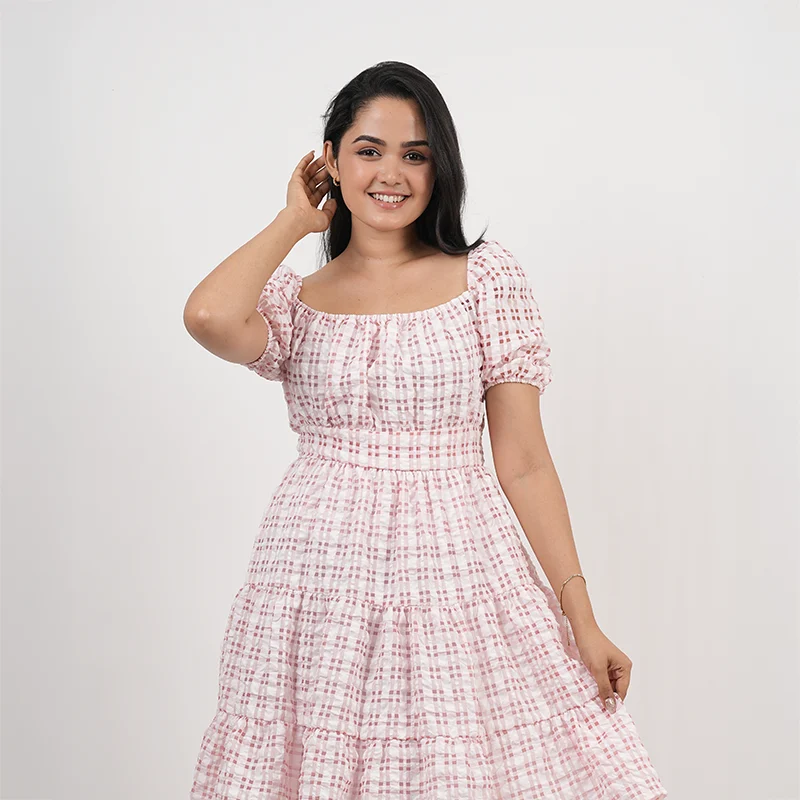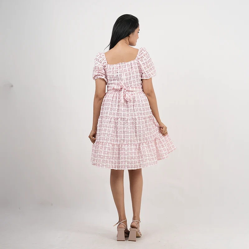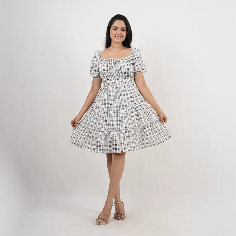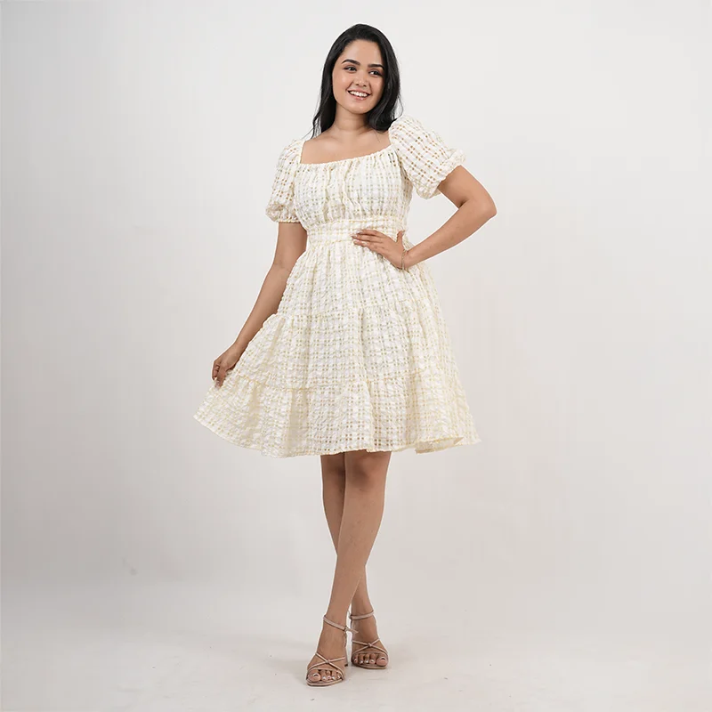Step into soft femininity with this beautifully tailored mini dress that blends playful elegance with timeless appeal. Designed with a flattering square neckline and delicate puffed sleeves, it gently hugs the bodice before flowing into a tiered, flared skirt that moves with effortless grace. The fitted waist enhances the silhouette, creating a charming and balanced look.