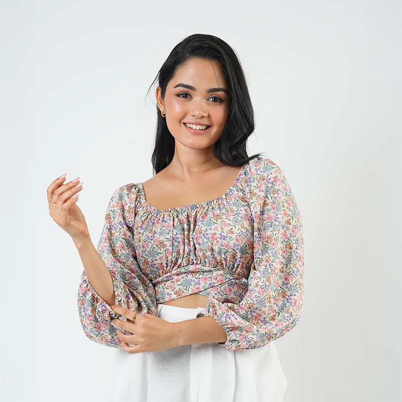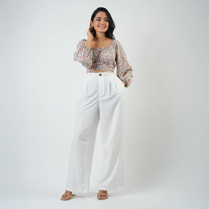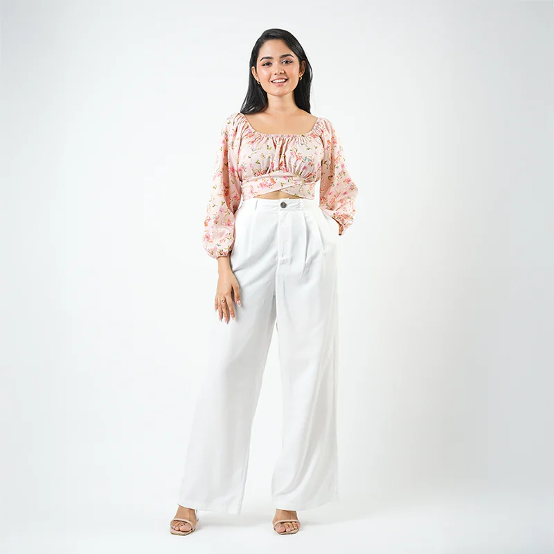 Effortless charm meets modern grace in this beautifully balanced co-ord set. The crop top features a soft gathered neckline and voluminous sleeves that bring a romantic touch, while the high-waisted trousers lend structure and sophistication with their flowy, tailored silhouette. Together, they create a look that’s playful yet polished.