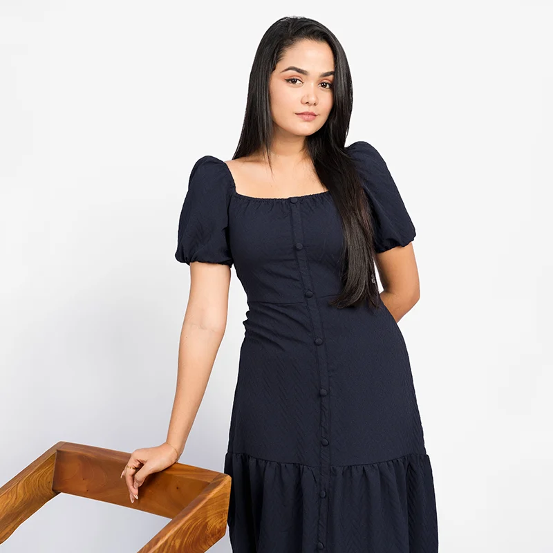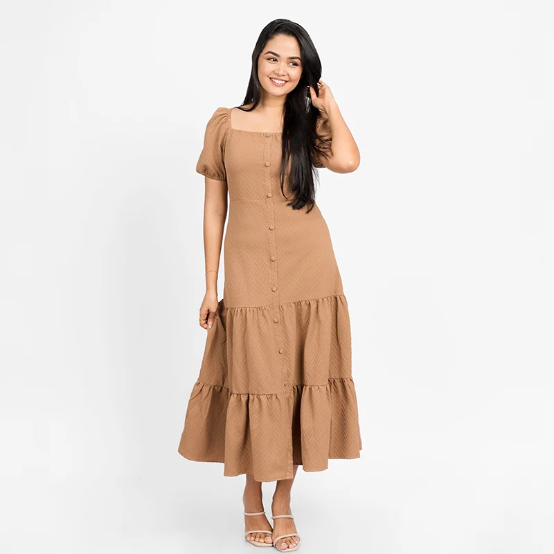 Charming and playful, this tiered midi dress brings a perfect blend of structure and ease. Designed with puff sleeves and a flattering square neckline, it features a full button-down front and softly gathered tiered hem that adds gentle volume and movement. The silhouette enhances your figure while offering a relaxed, feminine touch.
