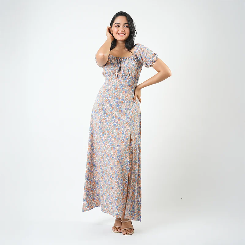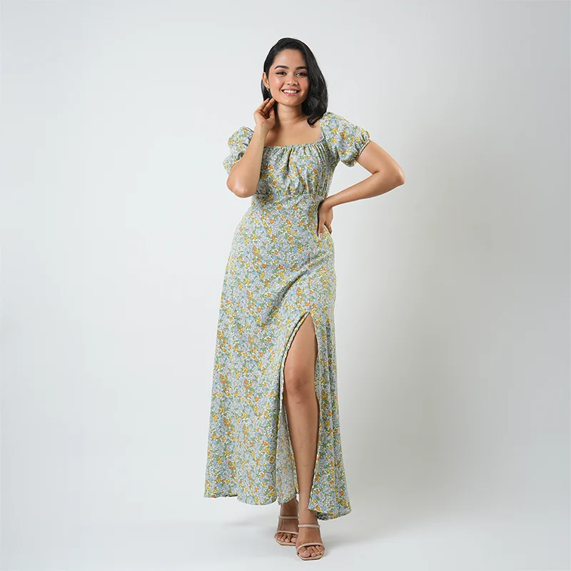 Effortlessly feminine and timeless, this maxi dress is designed to make every moment feel graceful. The ruched neckline and puffed sleeves add a soft romantic touch, while the flowing skirt with a side slit creates a perfect balance of elegance and ease.