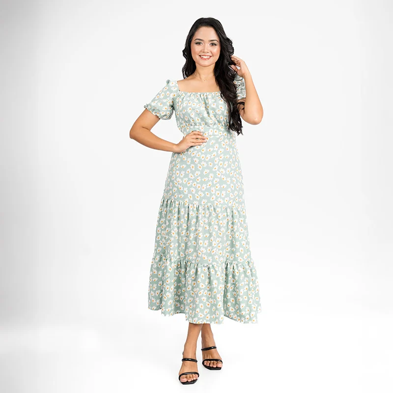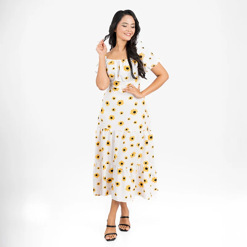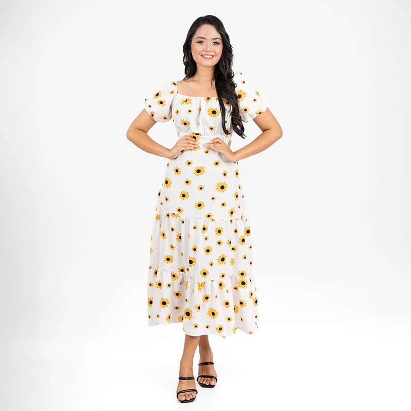 Radiate effortless charm with this beautifully designed midi dress. Crafted with soft and breathable maza material, it features a flattering off-shoulder neckline that adds a touch of romance. The delicate elasticized sleeves offer a comfortable fit while enhancing the dress’s feminine appeal. A cinched waist highlights your silhouette, and the flowing tiered skirt creates graceful movement, making this dress a dreamy choice for any occasion.