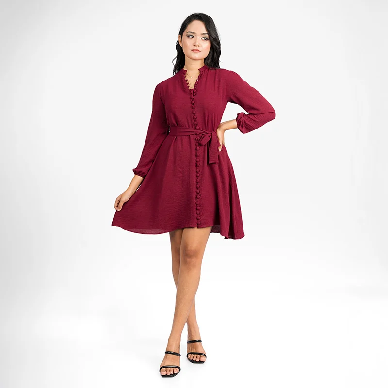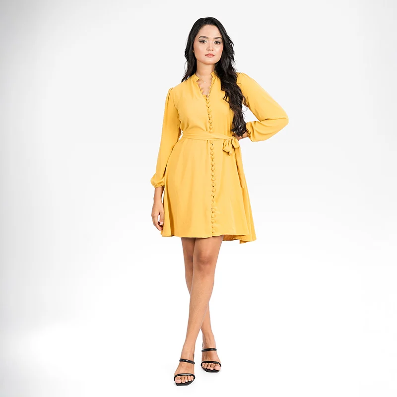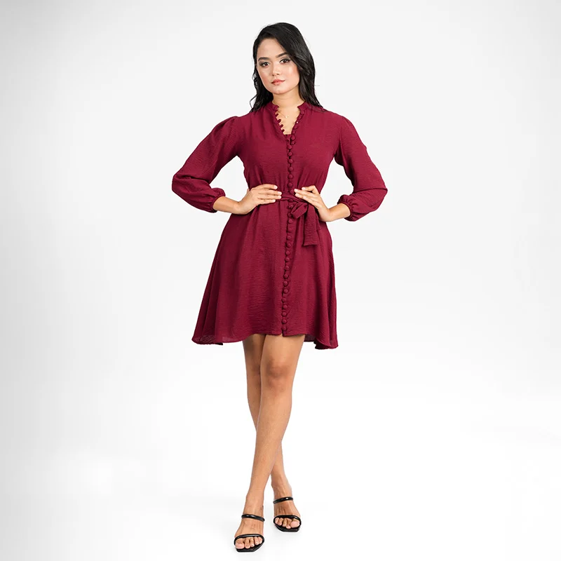 Exude elegance and grace with this timeless A-line dress. Designed with lightweight and breathable maza material, this dress drapes beautifully for a flattering silhouette. The delicately ruffled high neckline adds a refined charm, while the button-down front creates a classic, sophisticated look. The long, slightly puffed sleeves add a touch of vintage allure, making this dress perfect for any occasion. The self-tie belt cinches the waist, accentuating your figure and providing a polished finish.