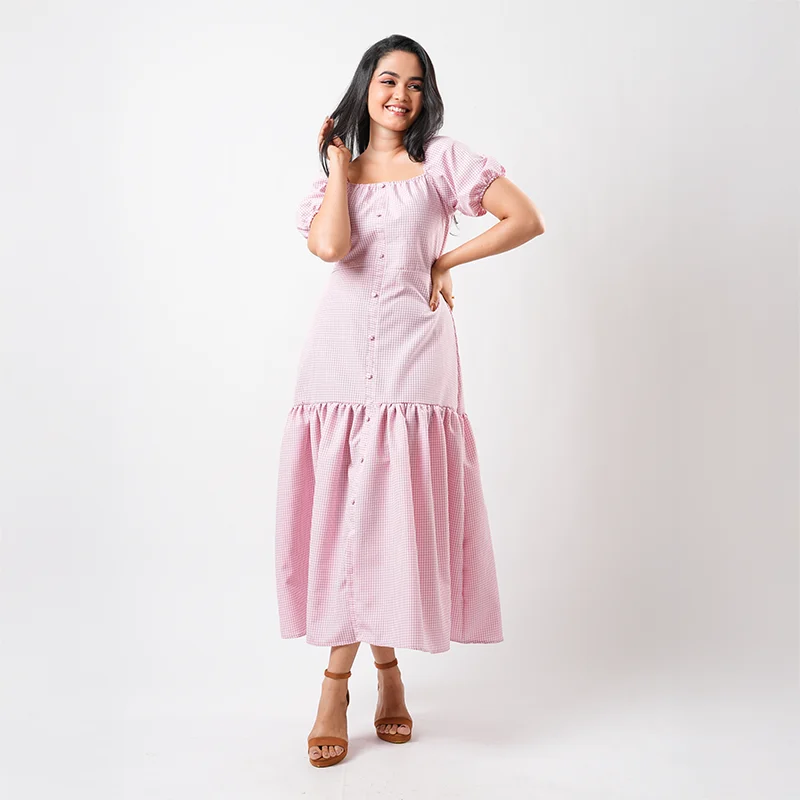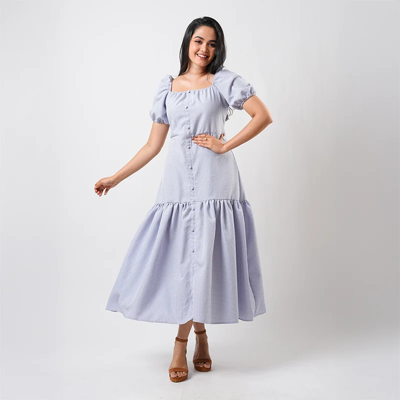 Crafted from breathable cotton check fabric, this dress offers lightweight comfort with a subtle textured finish. The natural weave ensures ease of wear throughout the day while maintaining a neat, structured drape.