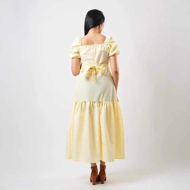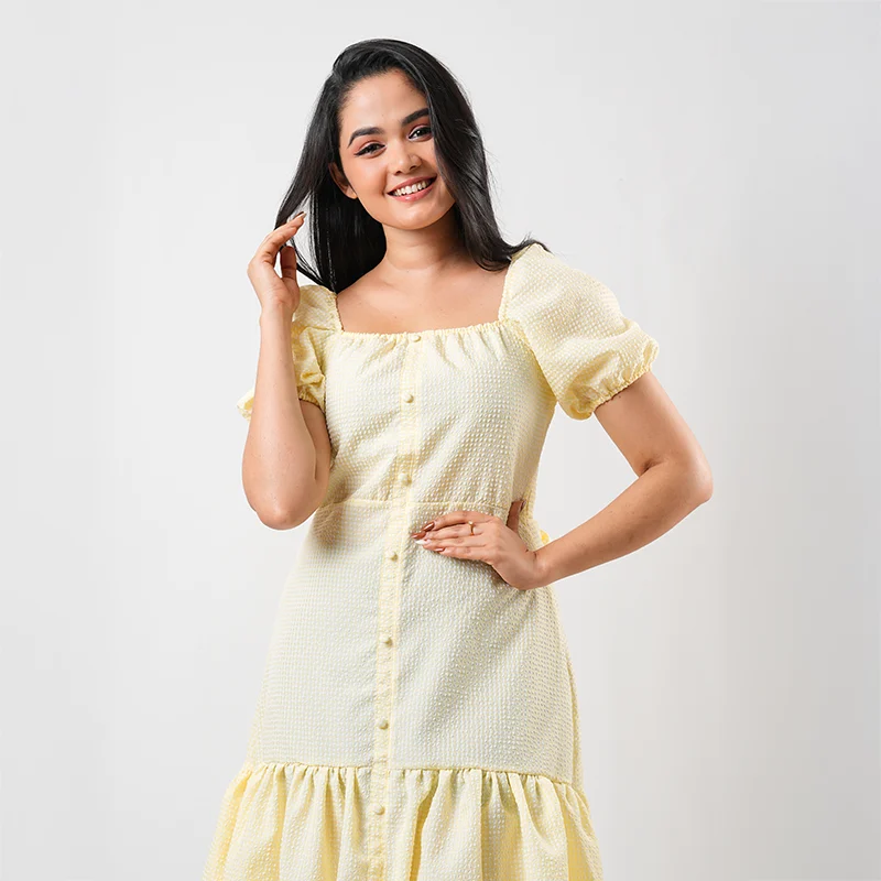 Embrace effortless femininity with this charming midi dress designed for easy elegance. Featuring soft puffed sleeves and a gentle square neckline, the fitted bodice is accentuated with delicate front button detailing. The waist is subtly defined before flowing into a softly gathered tiered hem, creating graceful movement and a flattering silhouette.