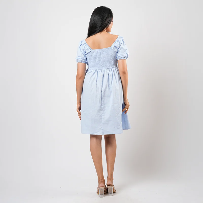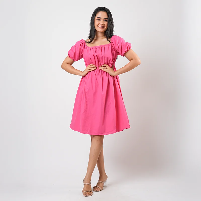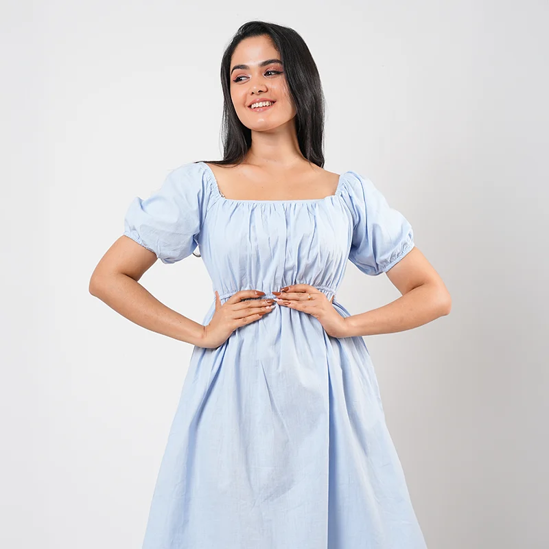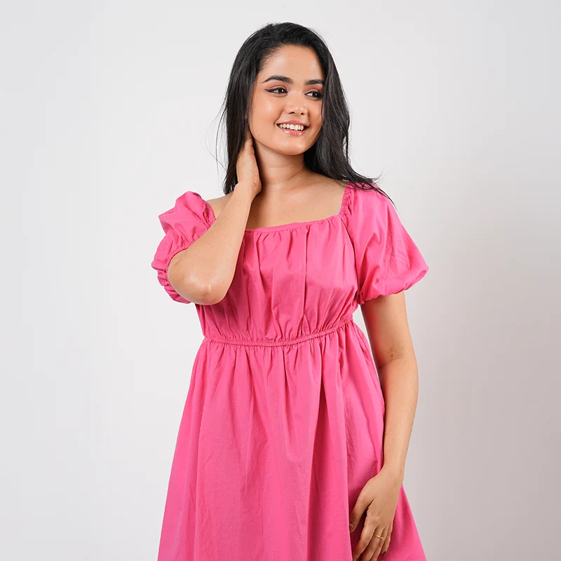 Delight in effortless charm with this breezy mini dress, featuring soft puffed sleeves and a flattering square neckline. The gently gathered bodice flows into a flared skirt, creating a playful and feminine silhouette that’s perfect for warm, sunny days or casual outings.