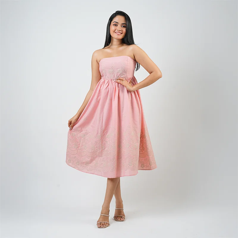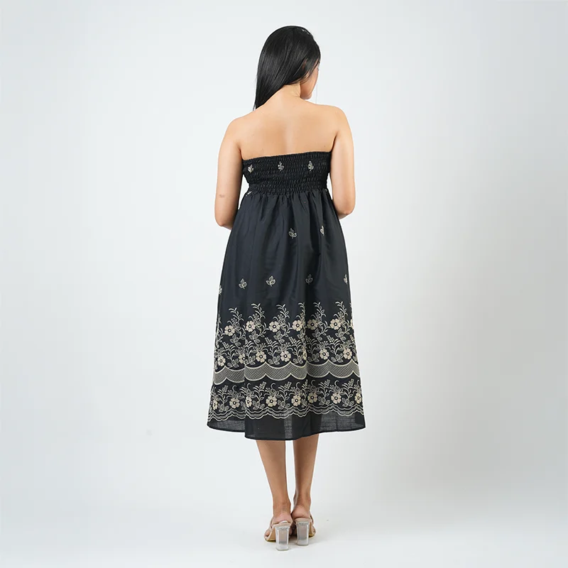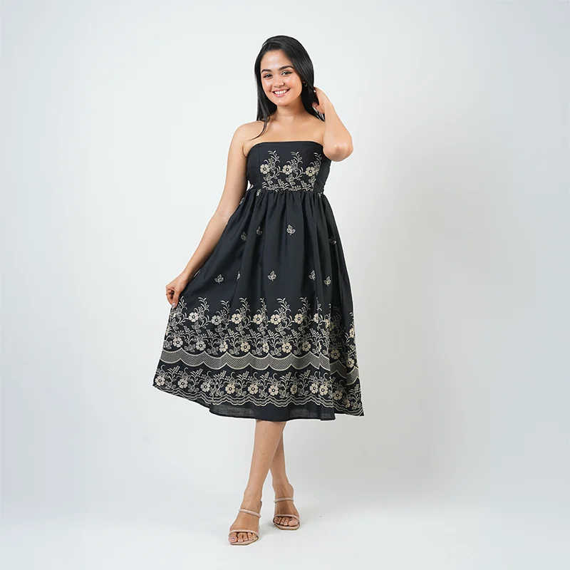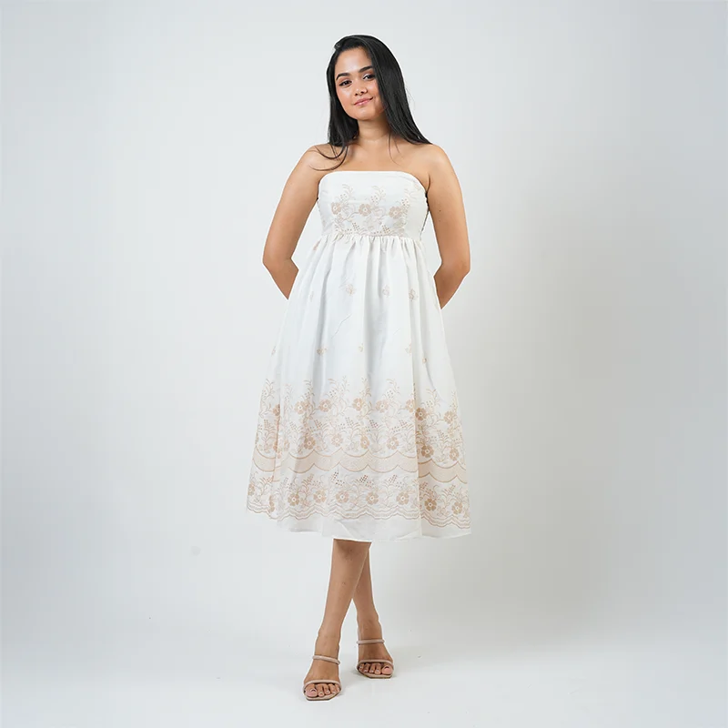 Effortlessly chic and timeless, this strapless midi dress captures the essence of graceful femininity. The delicately embroidered hem adds a touch of elegance, while the softly gathered waist creates a flattering, flowy silhouette perfect for any occasion.