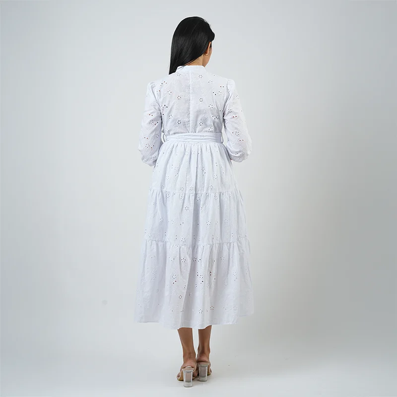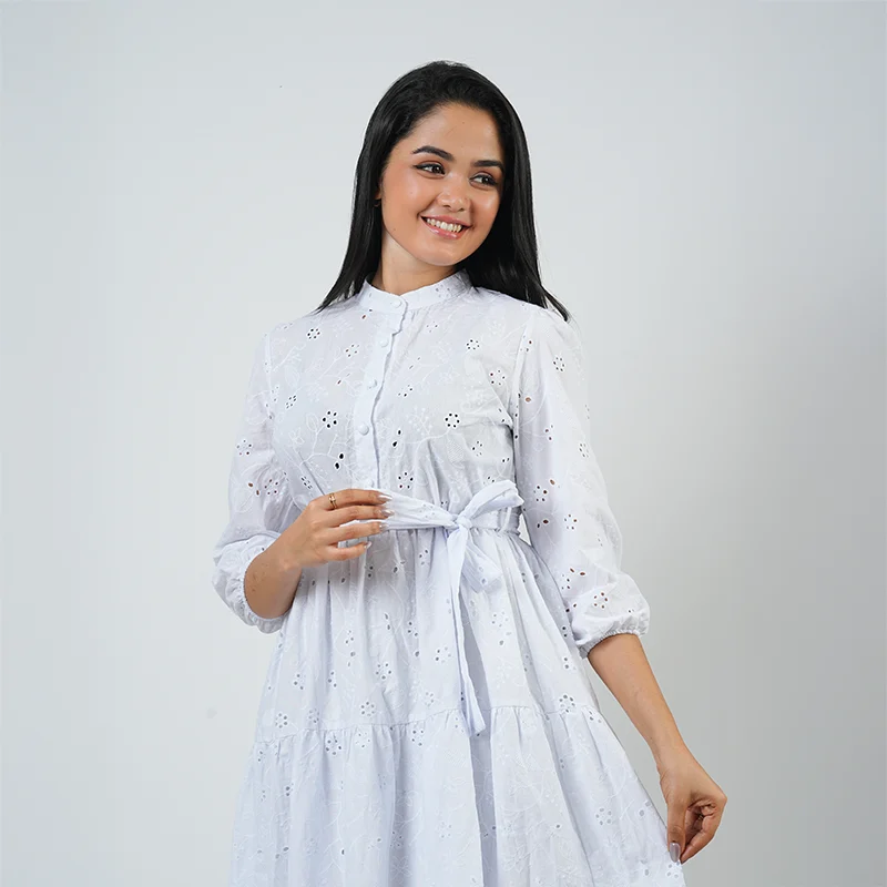 Radiate effortless elegance in the Elara Eyelet Midi Dress — a perfect blend of sophistication and comfort. Designed with a refined high neckline, gathered sleeves, and a flattering waist tie, this dress enhances your natural silhouette while maintaining a breezy, graceful flow. The intricate eyelet detailing adds a timeless, feminine touch to its classic shape.
