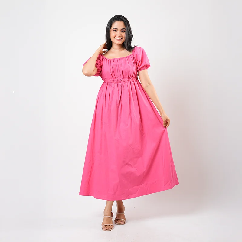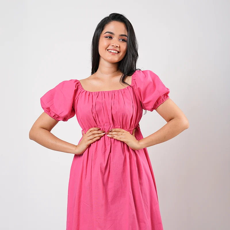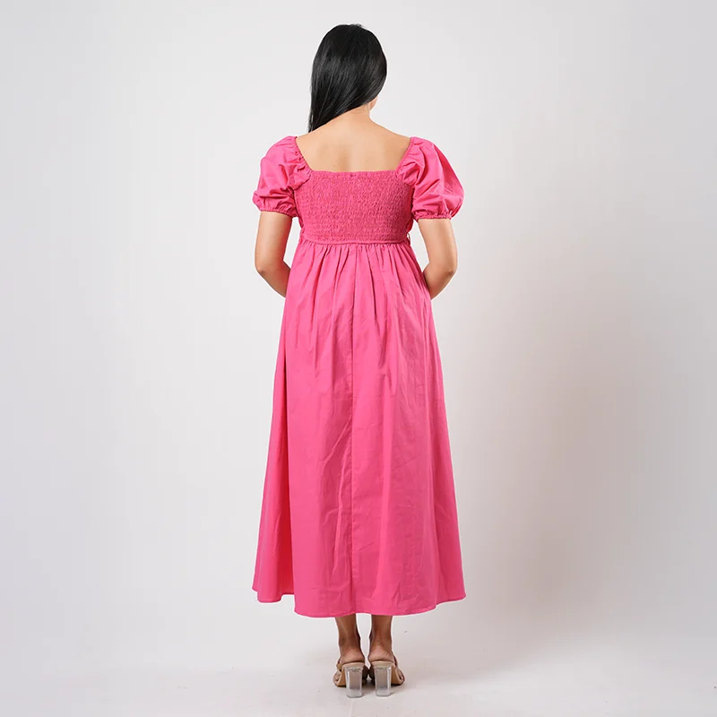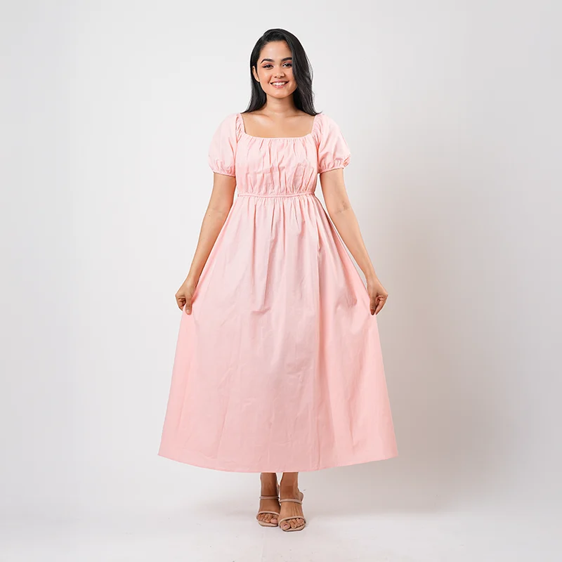 Embrace soft elegance with this beautifully flowing midi dress designed for timeless appeal. Featuring a classic square neckline and gently puffed short sleeves, the dress cinches subtly at the waist before falling into a relaxed, flared skirt that moves effortlessly. Its clean, minimalist silhouette offers a refined yet romantic look, perfect for everyday grace.