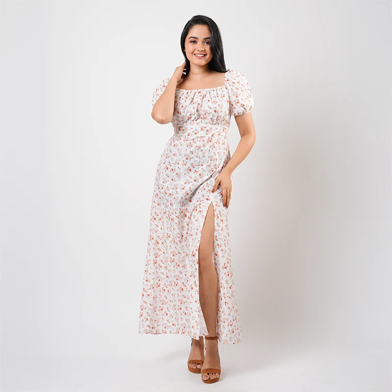 Step into effortless elegance with this beautifully tailored maxi dress designed to flatter and flow. Featuring soft puffed sleeves and a gently gathered neckline, the silhouette is enhanced with a defined waist and a graceful side slit that adds movement and modern charm. The streamlined fit creates a balanced blend of comfort and sophistication.