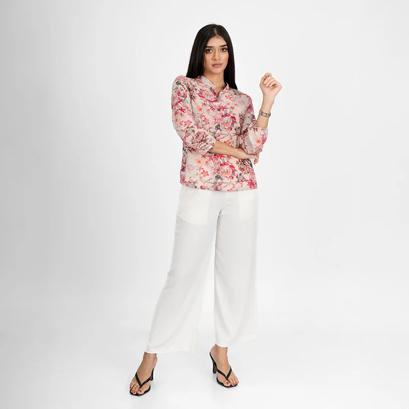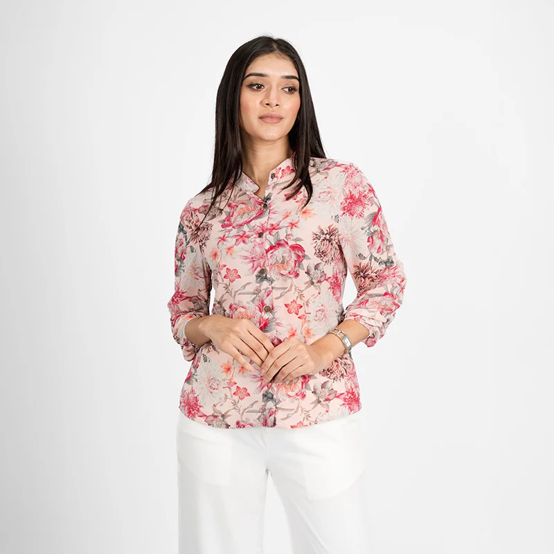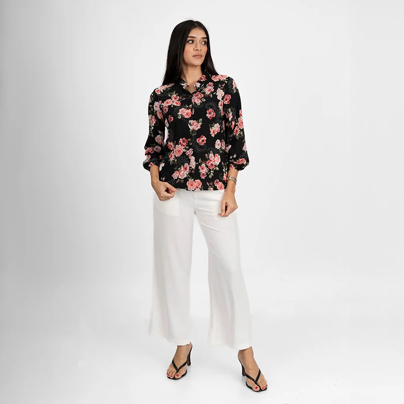 Refined and effortlessly stylish, this floral button-up blouse is a timeless addition to any wardrobe. The classic collared neckline and softly gathered sleeves create a polished yet relaxed silhouette, perfect for both casual and semi-formal occasions. The delicate floral pattern adds a touch of romance, while the lightweight fabric ensures comfort throughout the day.