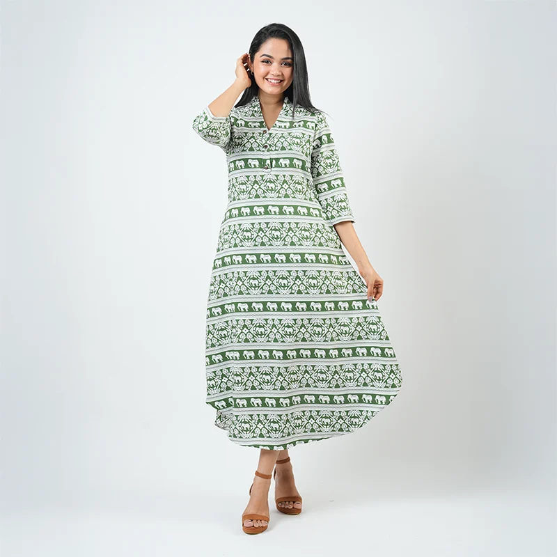 Step into effortless charm with this beautifully patterned midi dress, designed to bring a touch of artistry to your everyday style. The refined V-neckline and three-quarter sleeves create a poised, graceful silhouette, while the gently flared hem adds soft movement with every step. The intricate motif work elevates the look, giving it a unique, timeless character.