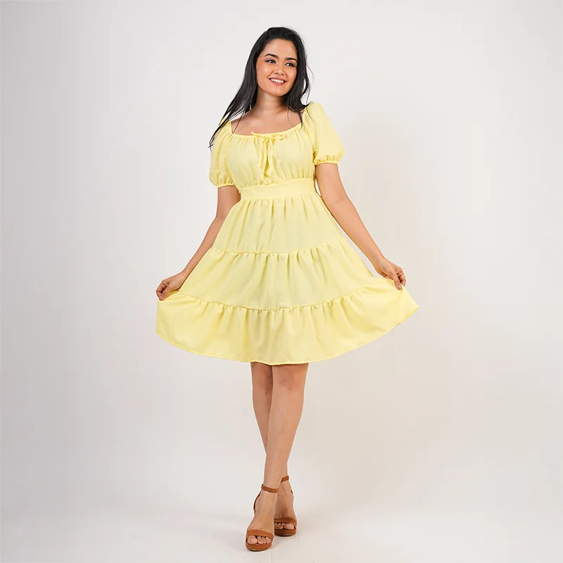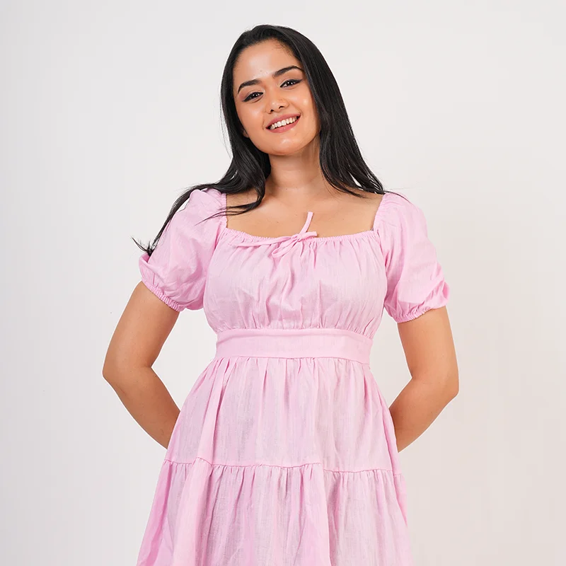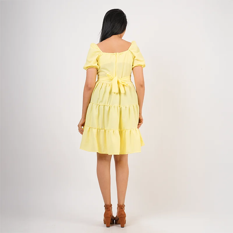 Designed for graceful ease, this tiered dress brings together soft structure and flowing movement. Featuring gently puffed sleeves and a flattering square neckline with delicate gathers, the silhouette is enhanced by a defined waist and a softly flared, tiered skirt. The result is a look that feels feminine, balanced, and effortlessly elegant.