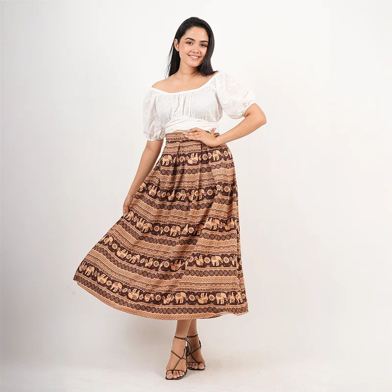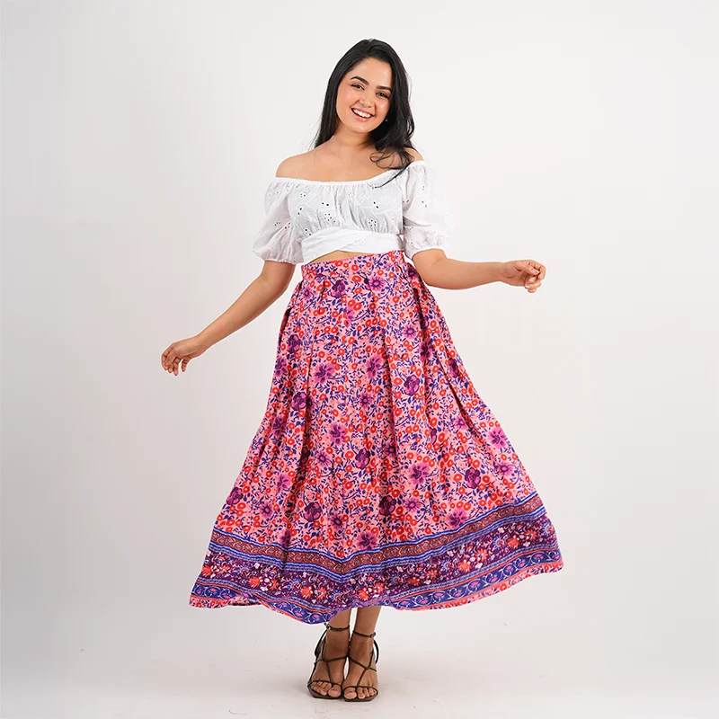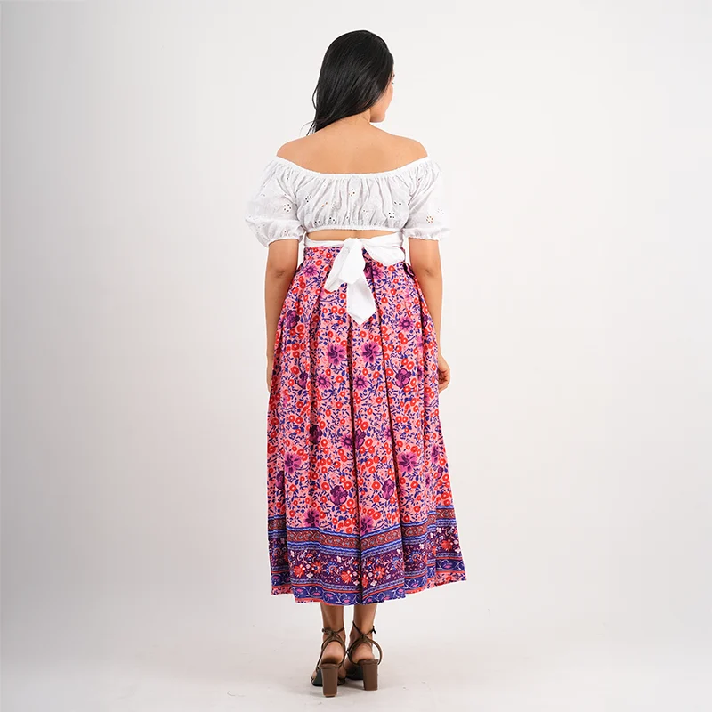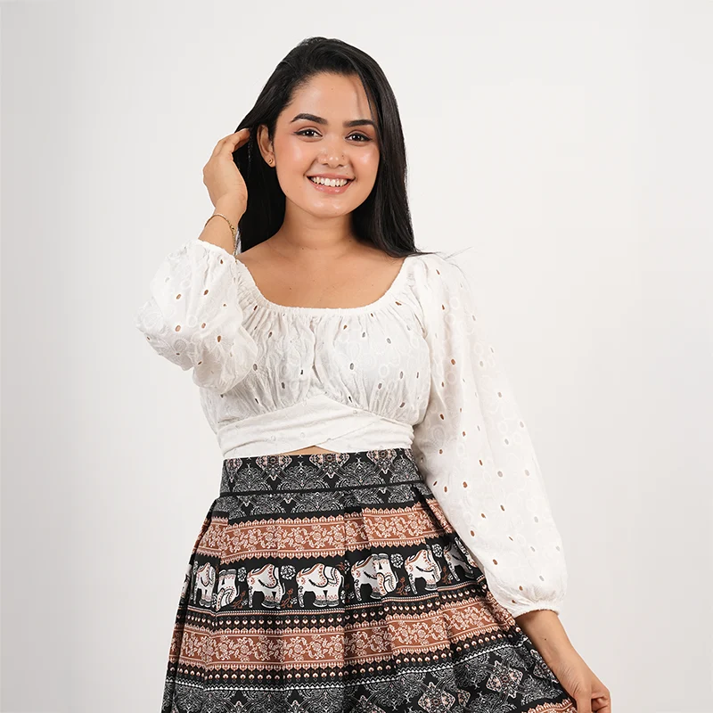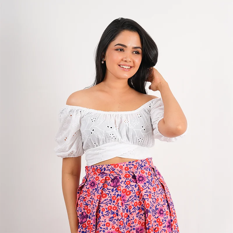 Step into playful elegance with this charming crop and skirt set, designed to capture a breezy, feminine spirit. The off-shoulder crop top features soft puffed sleeves and a gently gathered neckline, creating a flattering and romantic silhouette. Paired with a flowy, high-waisted skirt adorned with delicate prints and a statement border, the set moves beautifully with every step, offering both comfort and effortless style.