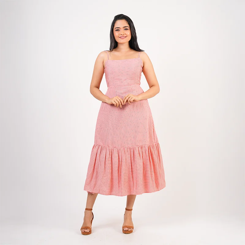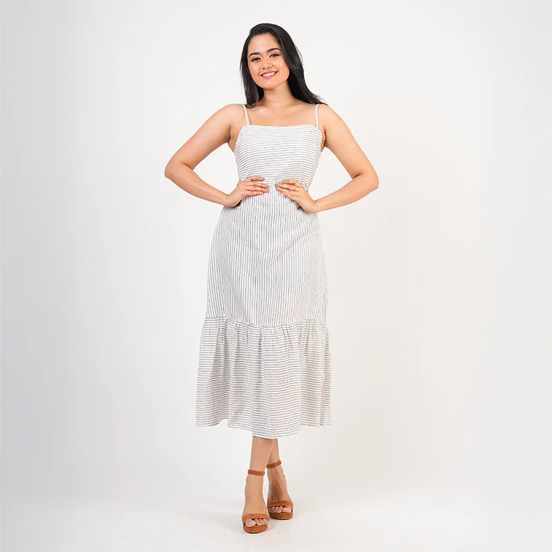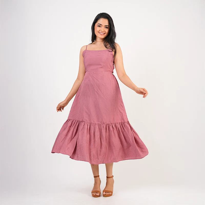 Embrace soft elegance with this beautifully flowing midi dress designed to flatter and captivate. Featuring slender shoulder straps and a gently fitted bodice, the silhouette flows into a relaxed, tiered skirt that moves gracefully with every step. The statement back tie detail adds a touch of charm while allowing an adjustable fit, creating a balanced look that feels both feminine and refined.