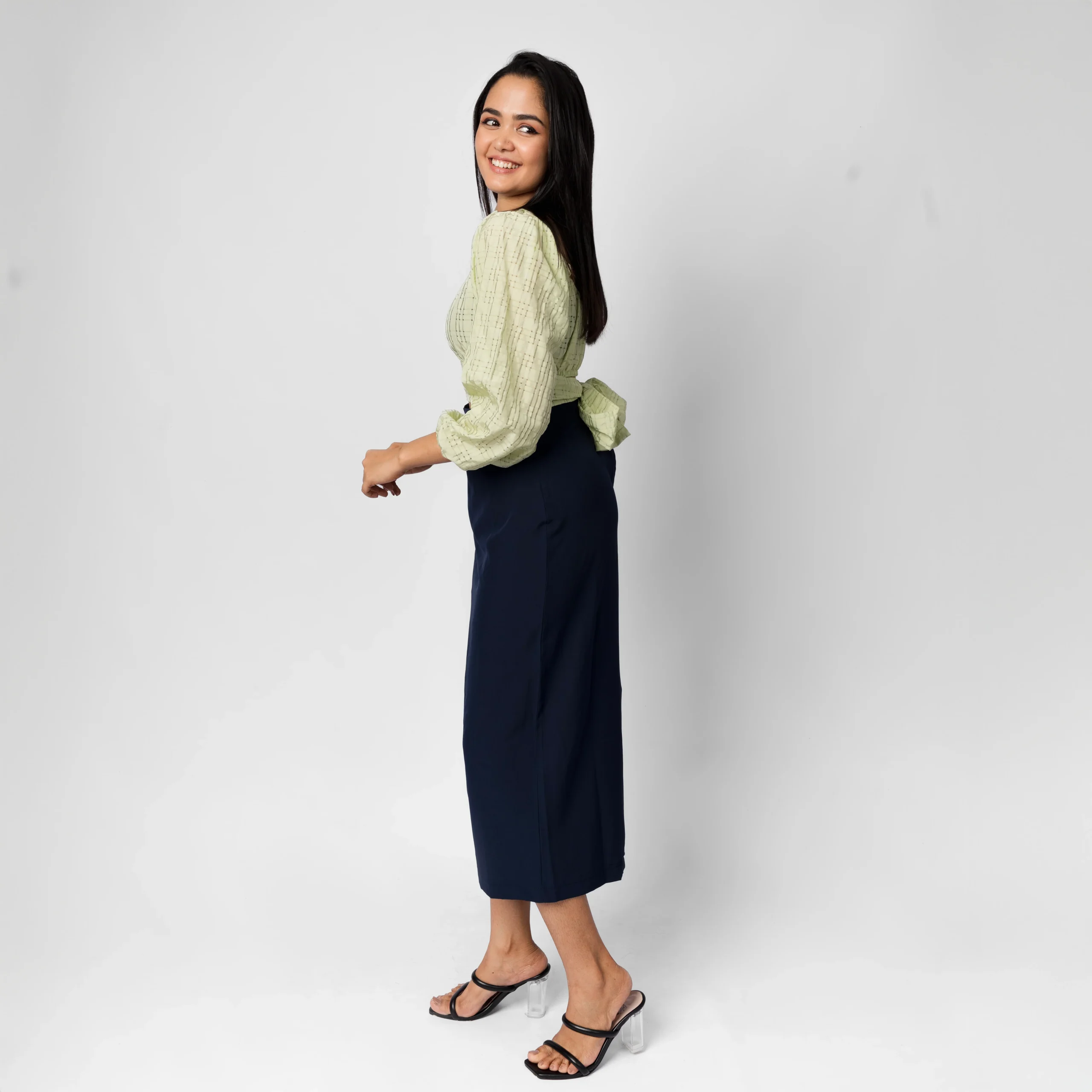 Radiating effortless grace, this two-piece set features a softly gathered blouse with voluminous sleeves paired with a sleek, high-waisted straight skirt. The balanced silhouette highlights feminine elegance while offering a contemporary, polished look. Together, the pieces create a versatile ensemble that transitions seamlessly from day to evening occasions.