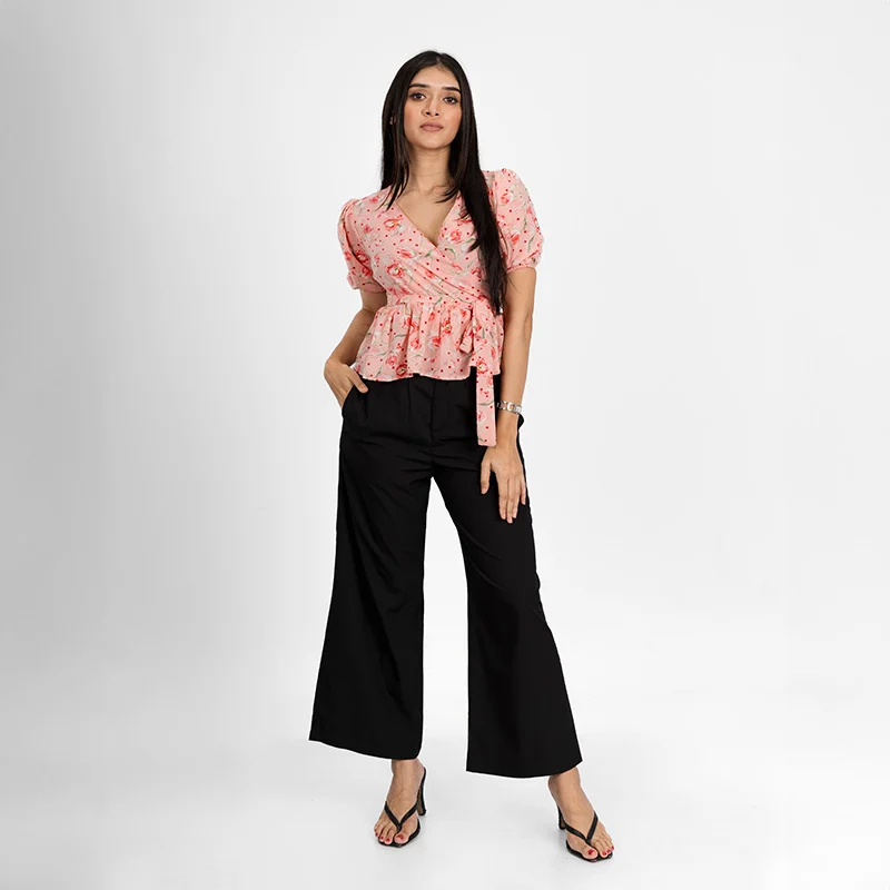 Elegant and effortlessly feminine, this wrap-style blouse showcases a delicate floral print that adds a romantic touch to any ensemble. The flattering V-neckline and short puffed sleeves enhance its classic appeal, while the fitted waist with a side-tie detail creates a beautifully contoured silhouette. The peplum hem offers a graceful flow, making this blouse a perfect blend of sophistication and charm.