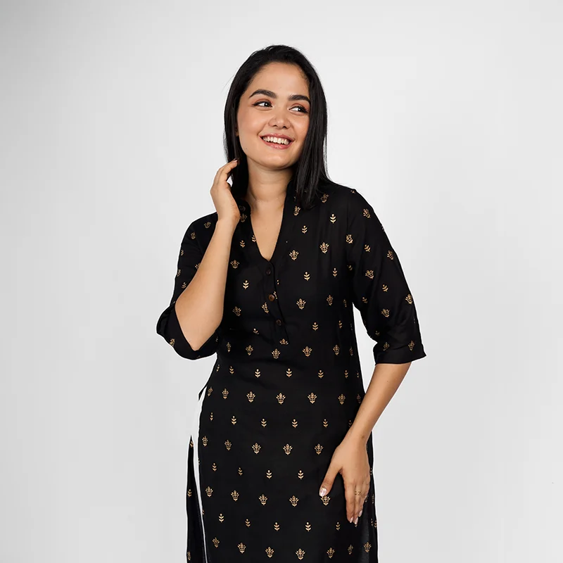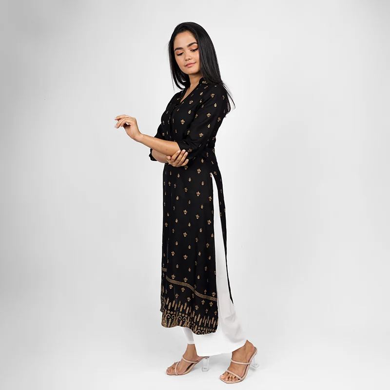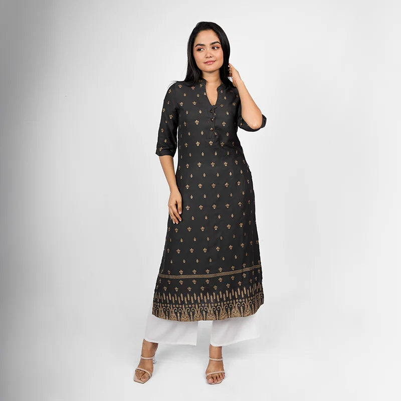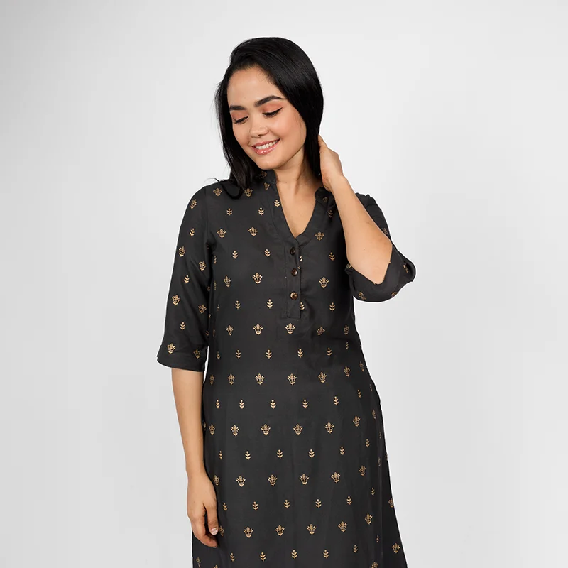 Bring effortless elegance to your wardrobe with this refined longline tunic, designed to blend timeless style with modern ease. Featuring a button-front neckline, three-quarter sleeves, and side slits for fluid movement, it offers a flattering silhouette that transitions seamlessly from day to night. The intricate all-over motif and detailed border hem add a touch of artisanal charm.