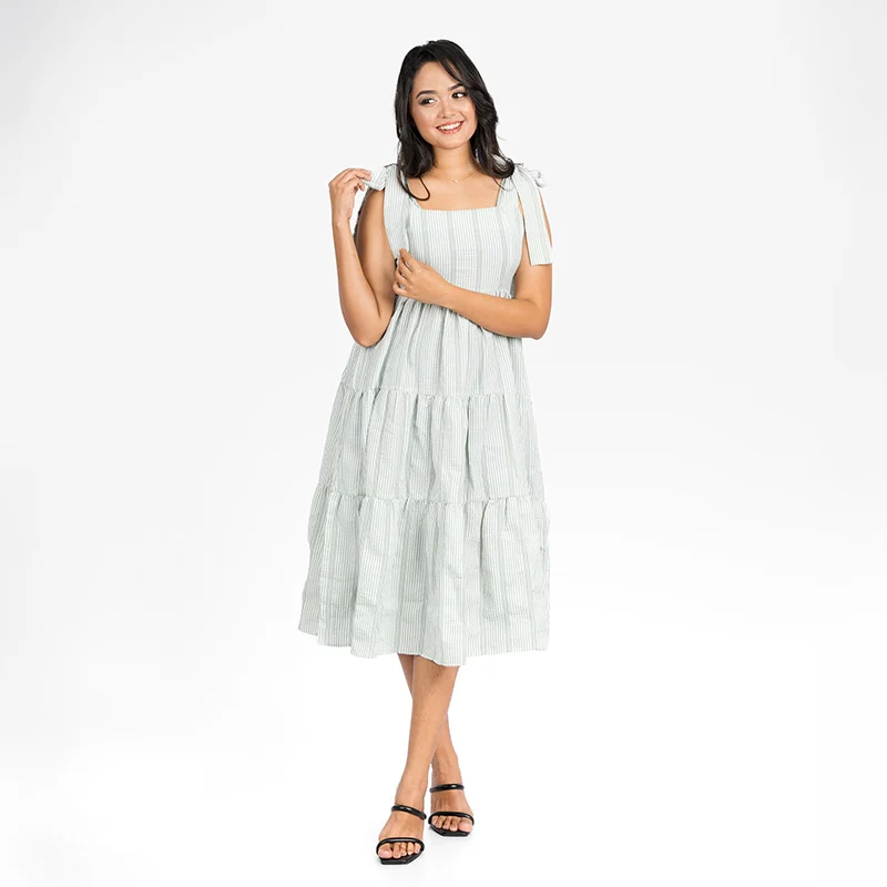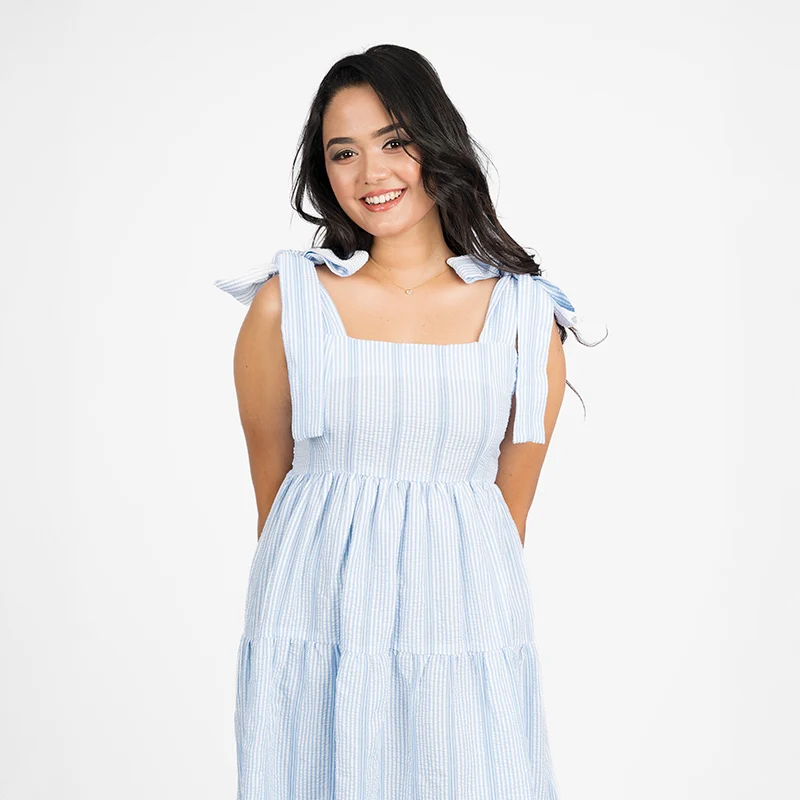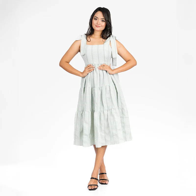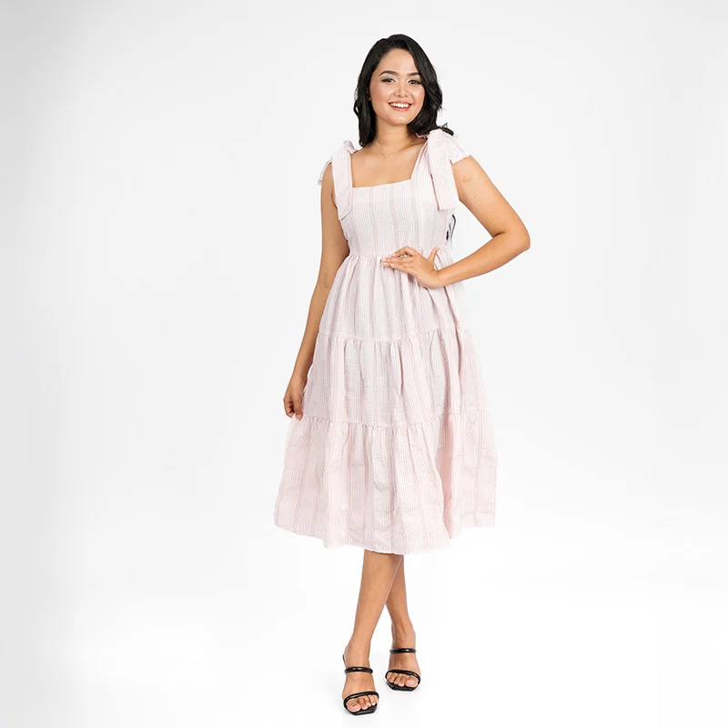 Step into effortless elegance with this enchanting tiered midi dress. Designed with delicate bow-tie straps and a smocked bodice, this dress offers a flattering fit while exuding charm and femininity. The flowing tiered skirt adds graceful movement, creating a breezy yet sophisticated look perfect for any occasion.