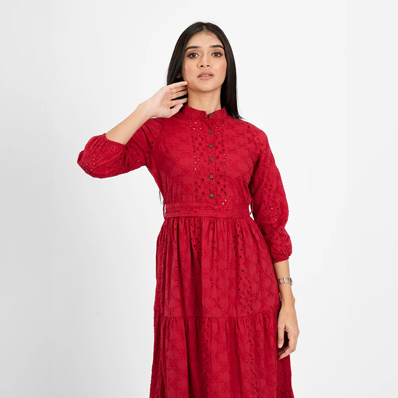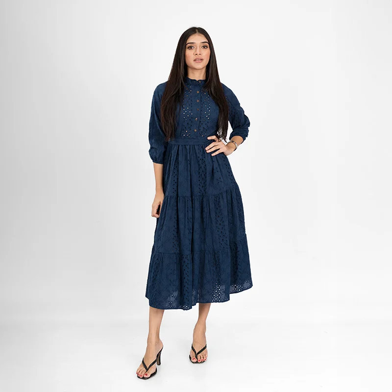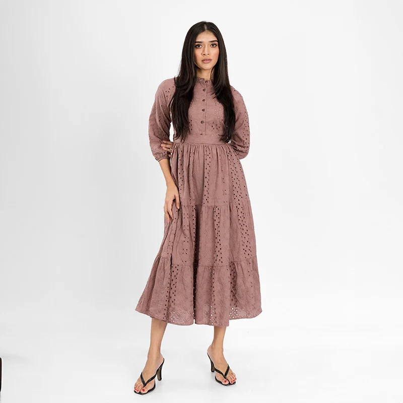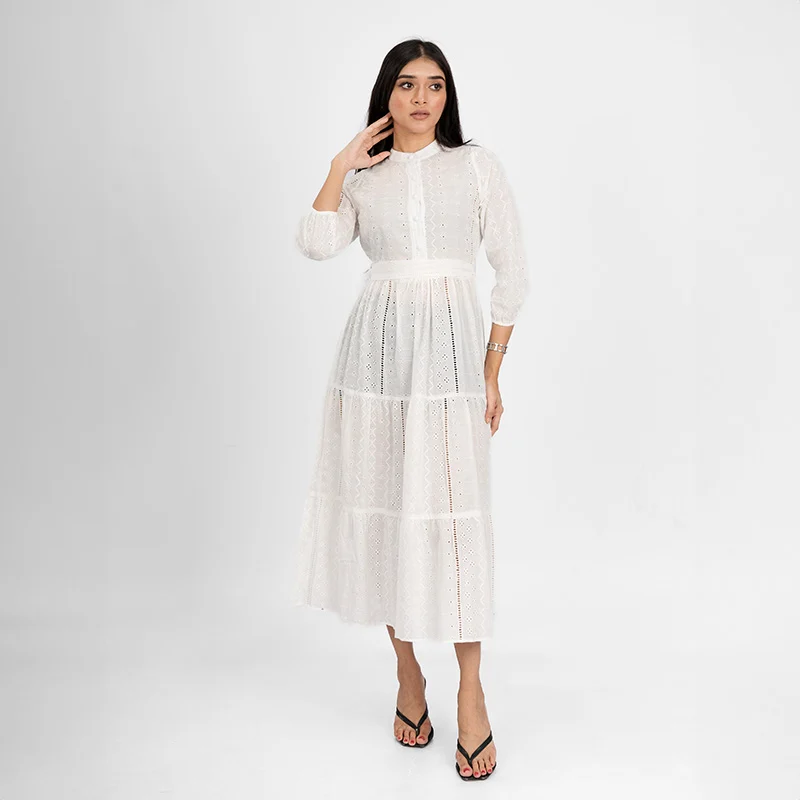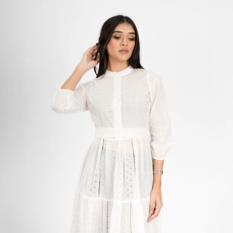 Step into effortless charm with this delicately crafted tiered midi dress. Designed with intricate eyelet detailing and a structured yet breezy silhouette, this dress exudes timeless femininity. The high neckline and three-quarter sleeves offer a modest yet stylish appeal, while the cinched waist enhances your natural shape. The cascading tiered skirt creates a flowy movement, making it an elegant choice for any occasion.