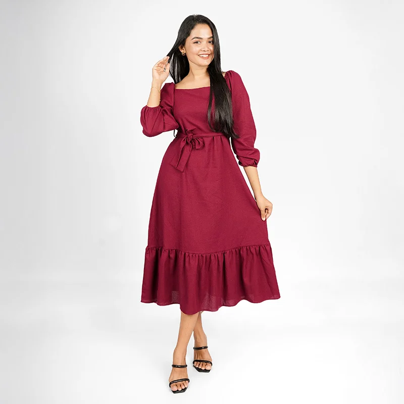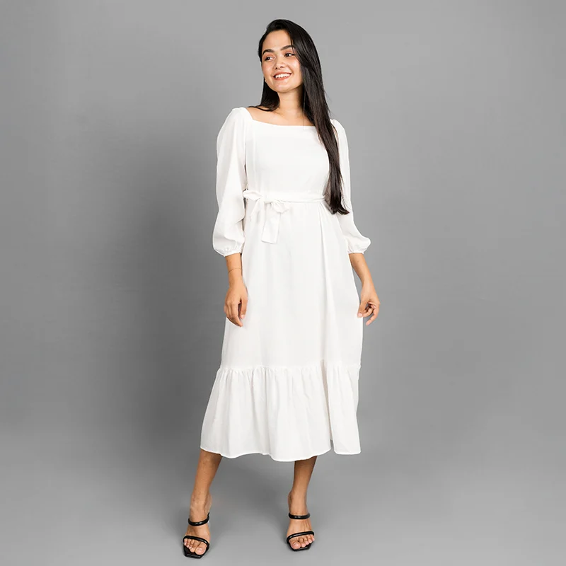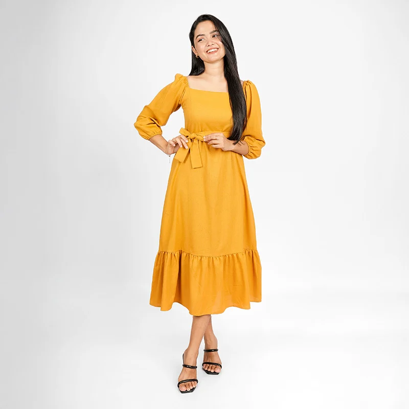 This effortlessly charming midi dress exudes elegance with its timeless silhouette. Featuring a flattering square neckline and delicate puffed sleeves, it brings a touch of femininity while maintaining a sophisticated appeal. The cinched waist is accentuated with a self-tie belt, ensuring a figure-enhancing fit, while the tiered ruffle hem adds graceful movement to every step. Perfectly blending comfort and style, this dress is a must-have for a refined yet relaxed look.