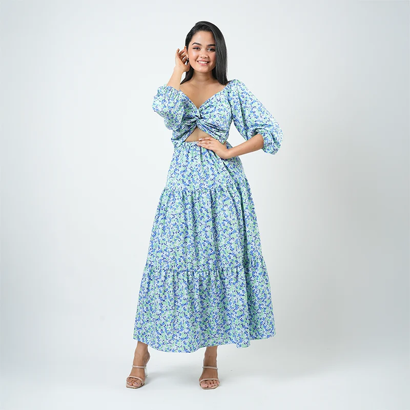 Radiate playful sophistication with the Isla Bloom Midi Dress — a captivating piece designed for both comfort and charm. Featuring a twisted front detail and a subtle cutout at the waist, this dress strikes the perfect balance between modern flair and feminine grace. The flowy tiered skirt adds soft movement, while the relaxed sleeves bring a breezy finish.
