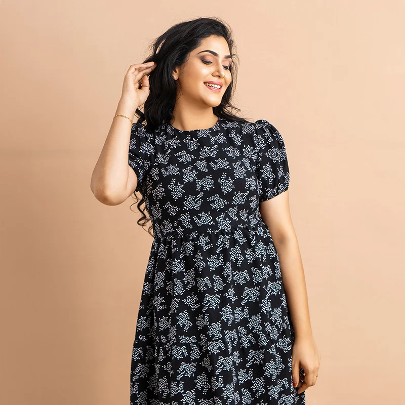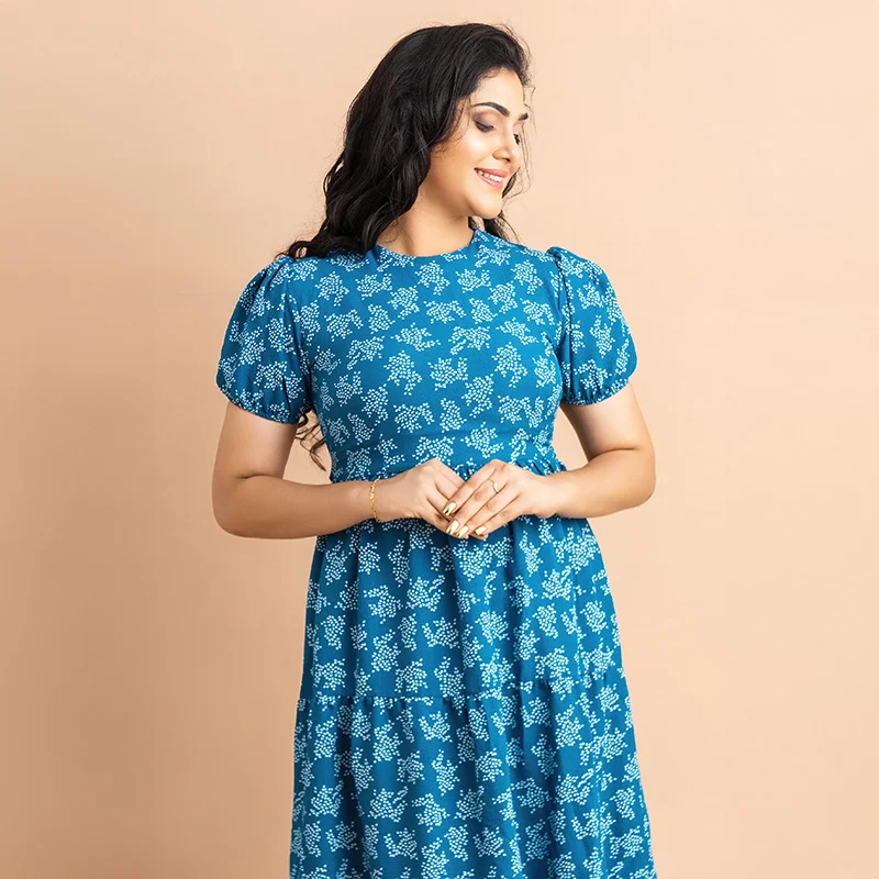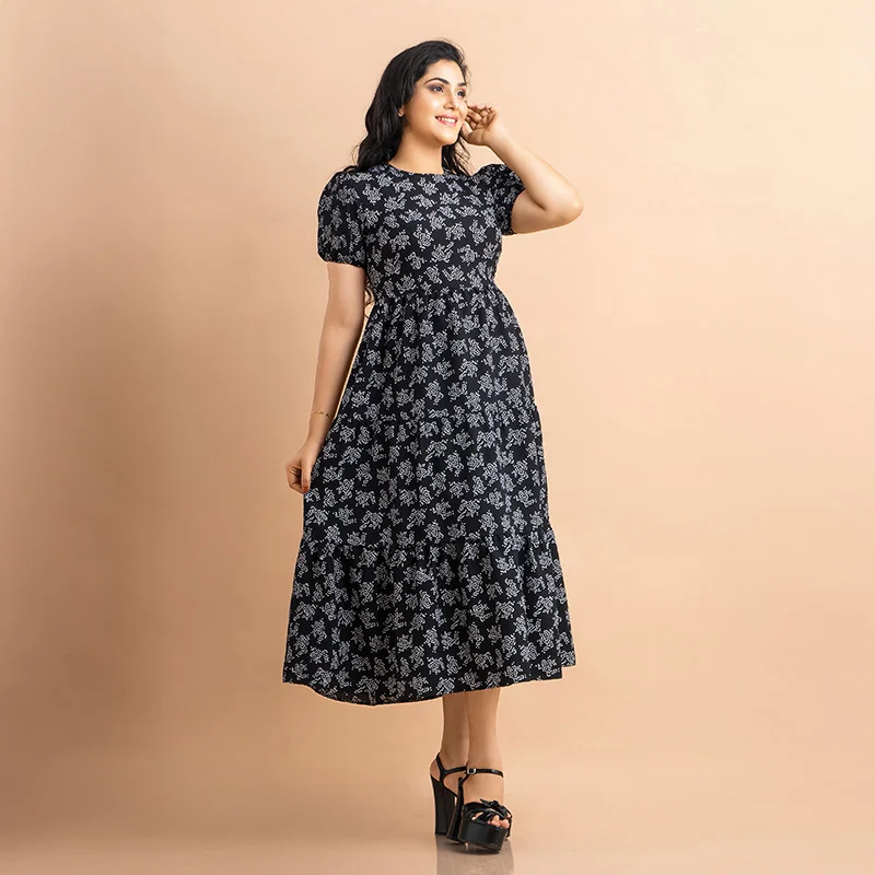The Kylie Floral Maxi Dress is your go-to choice for effortless elegance and comfort. Crafted from soft, breathable Cotton Flexy fabric, this dress features a delicate floral print, puffed short sleeves, and a timeless round neckline. The tiered maxi skirt adds playful movement while ensuring a flattering fit for various body shapes. Perfect for casual outings, brunches, or garden parties, it pairs beautifully with strappy heels or sandals. Elevate the look with simple jewelry for a chic yet understated style that works for any occasion.