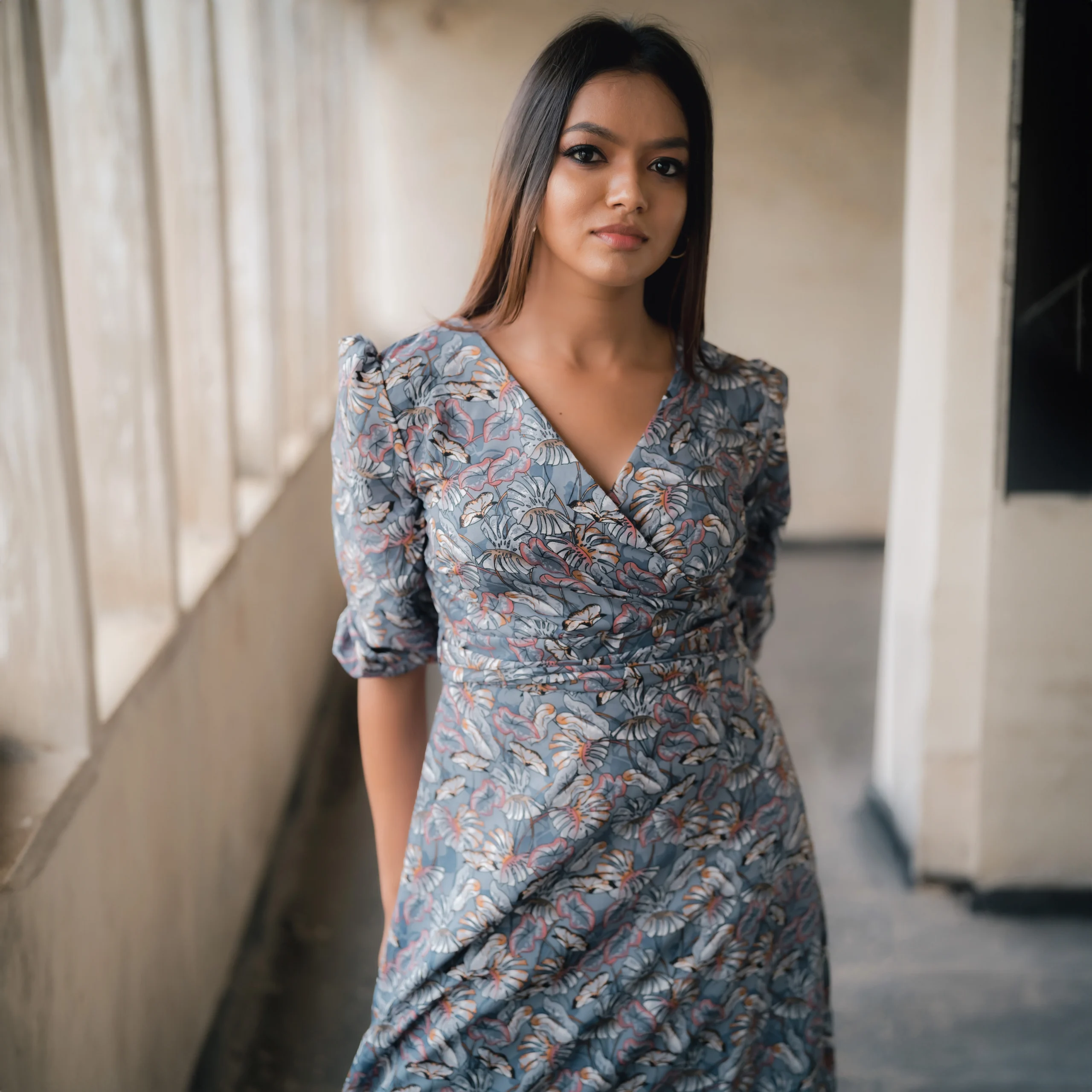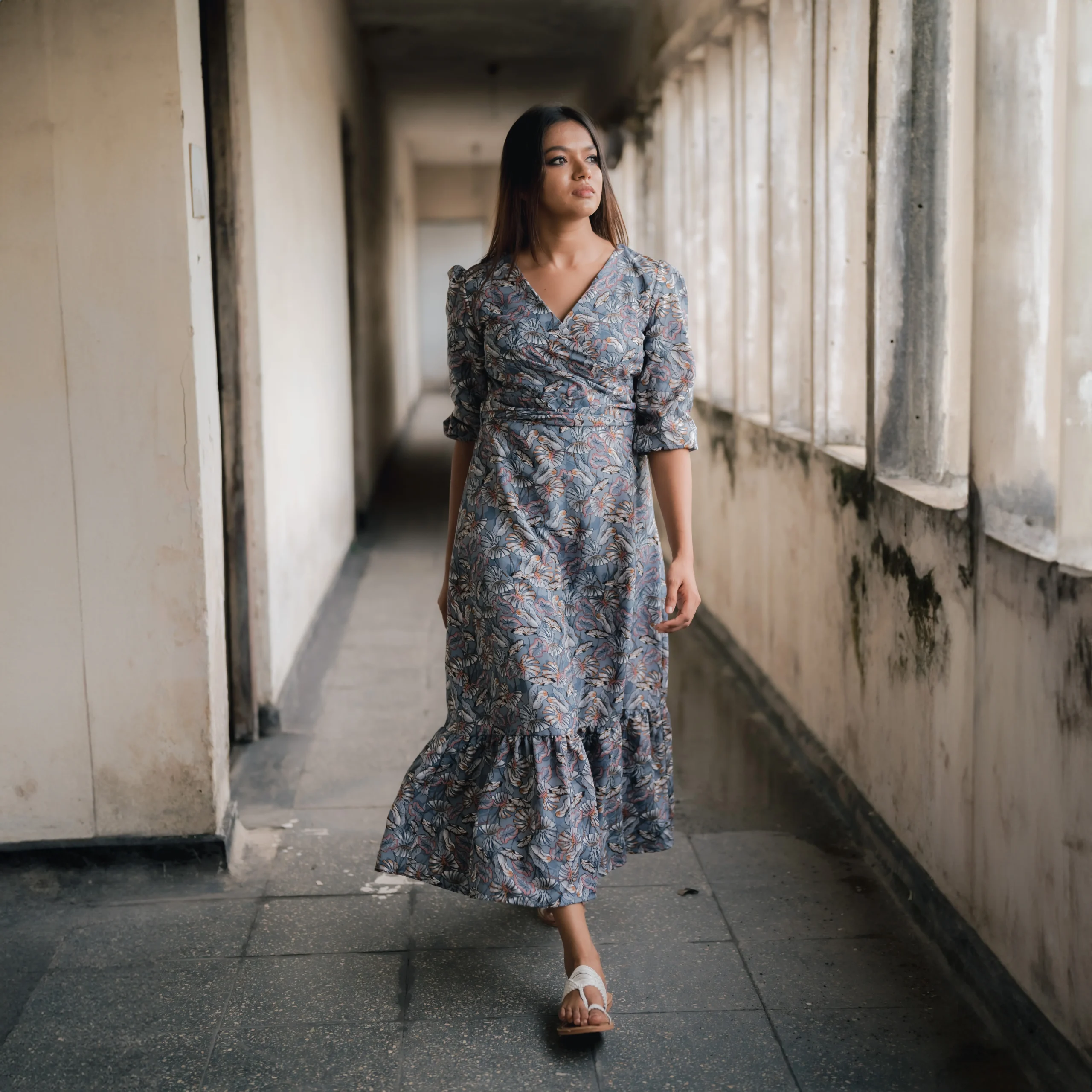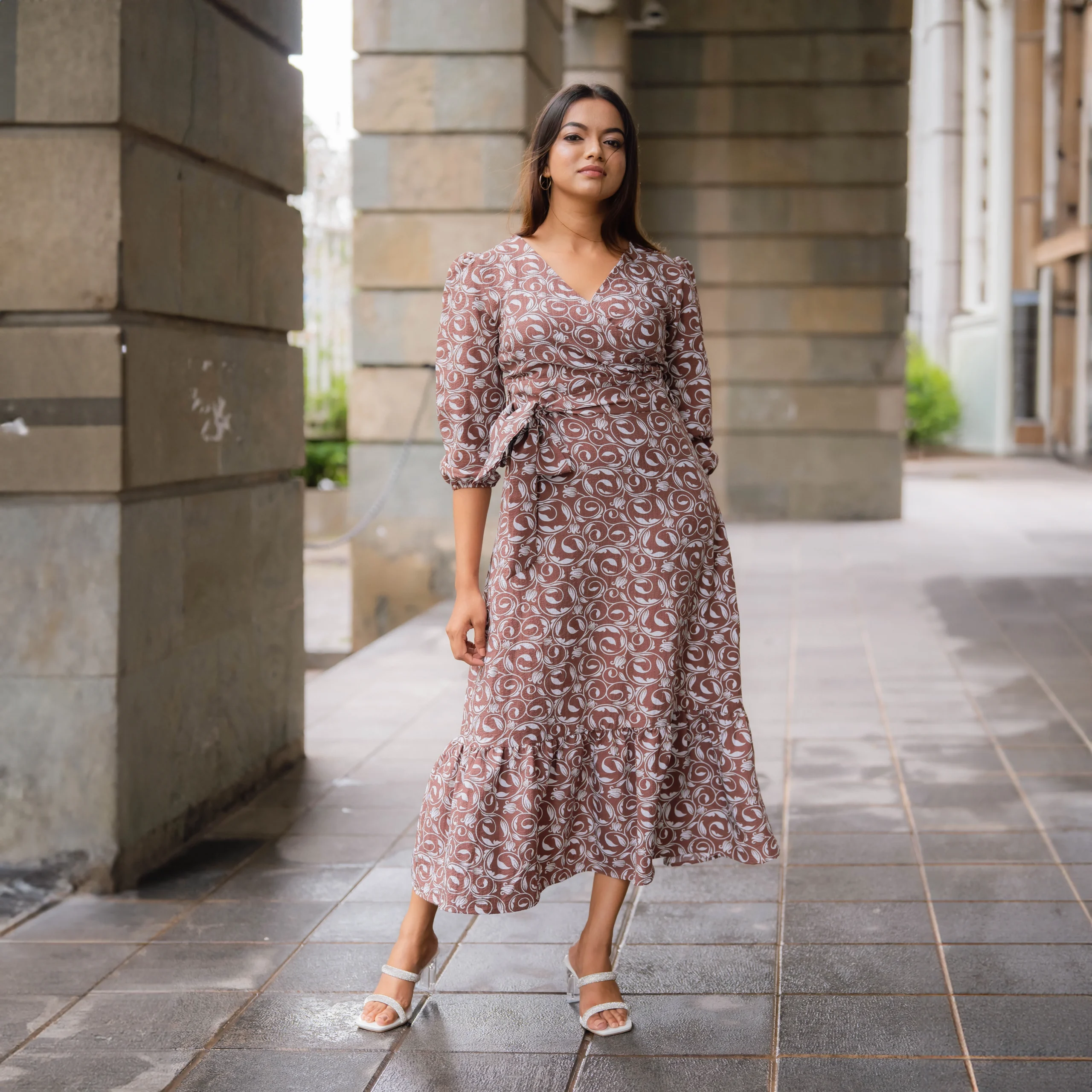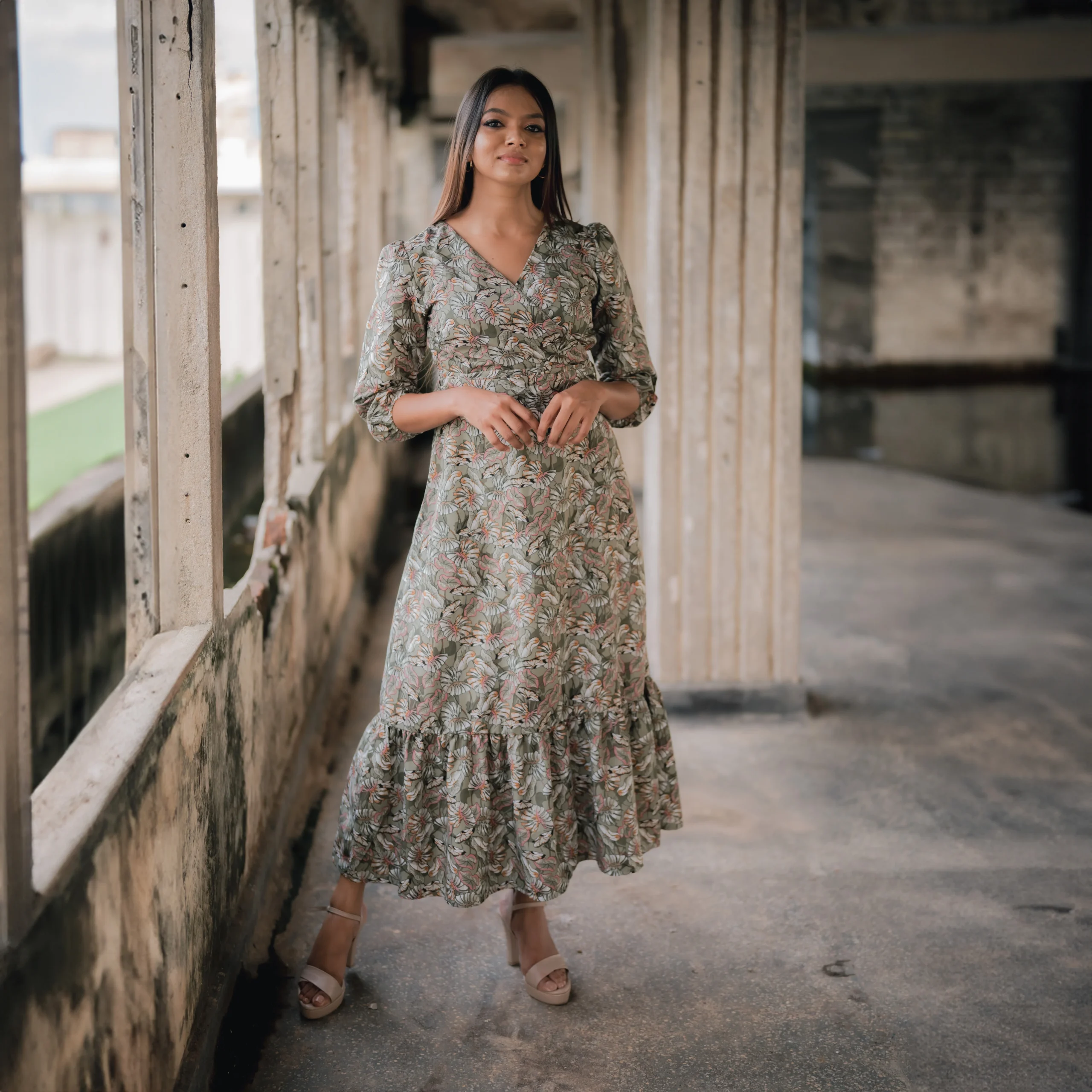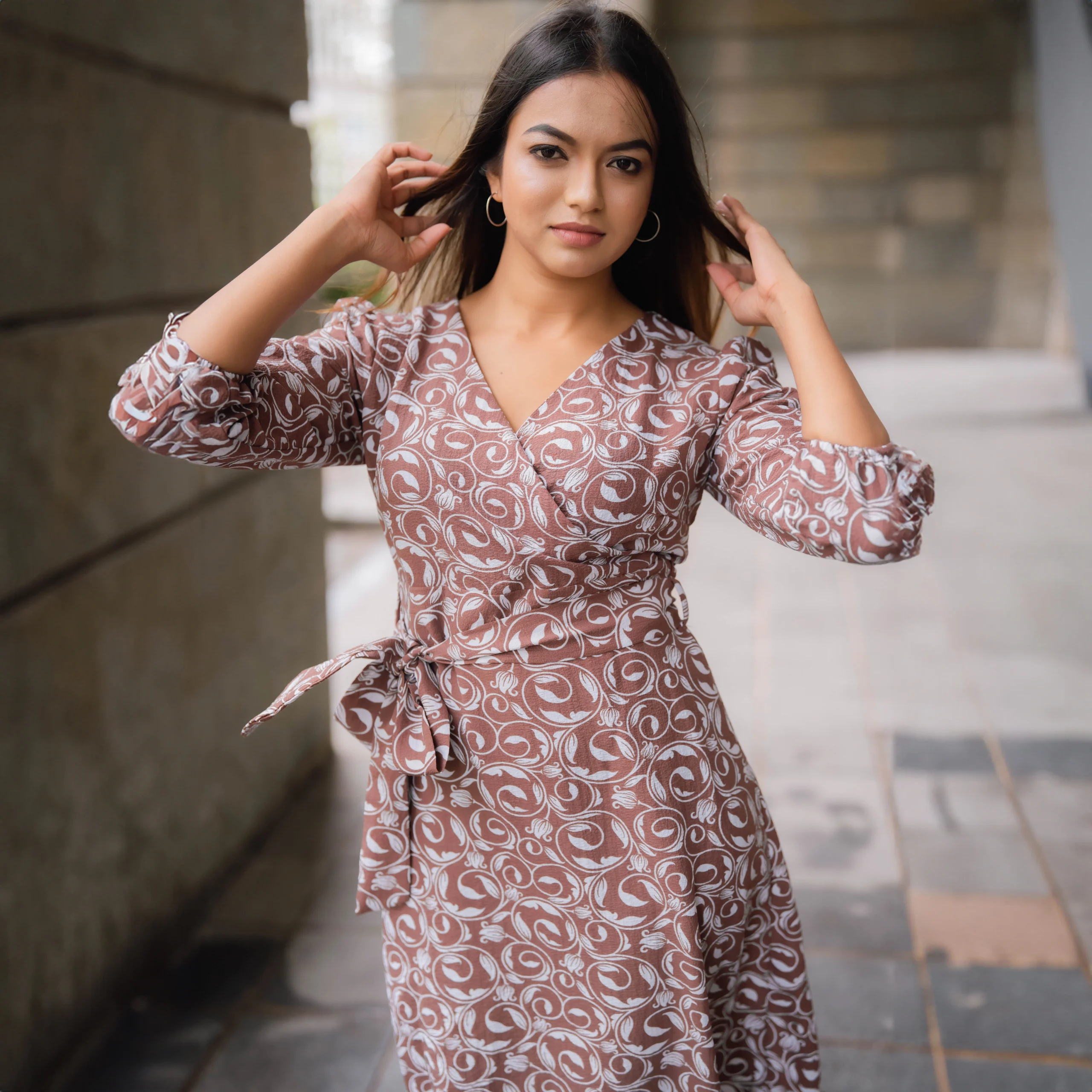 The Leah Cross-Over Midi Dress combines style and comfort, enhancing your silhouette with a flattering cross-over design and tie belt. Its three-quarter sleeves and soft, lightweight fabric offer ease of movement and all-day comfort. Featuring a delicate floral pattern in earthy tones, this dress adds bohemian charm to your wardrobe. Perfect for any occasion, pair it with sandals for a casual look or heels and statement jewelry for an evening out. Available in sizes UK 8-16.