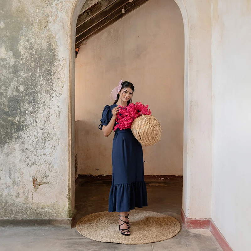 The Liana midi dress effortlessly combines elegance and comfort, making it a timeless addition to your wardrobe. Featuring a classic round neckline, puffed short sleeves, and a self-tie belt to accentuate your waist, this dress is crafted from high-quality CEY fabric for ultimate softness and drape. The mid-calf length skirt with a delicate ruffle hem adds a playful touch, perfect for any occasion. Pair it with your favorite heels or flats for a sophisticated look that’s versatile and chic.