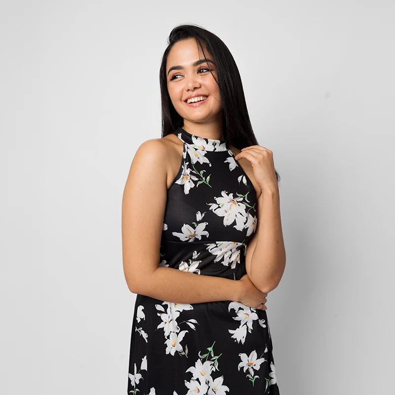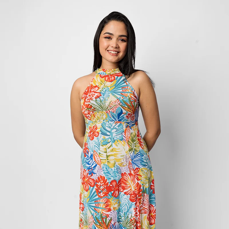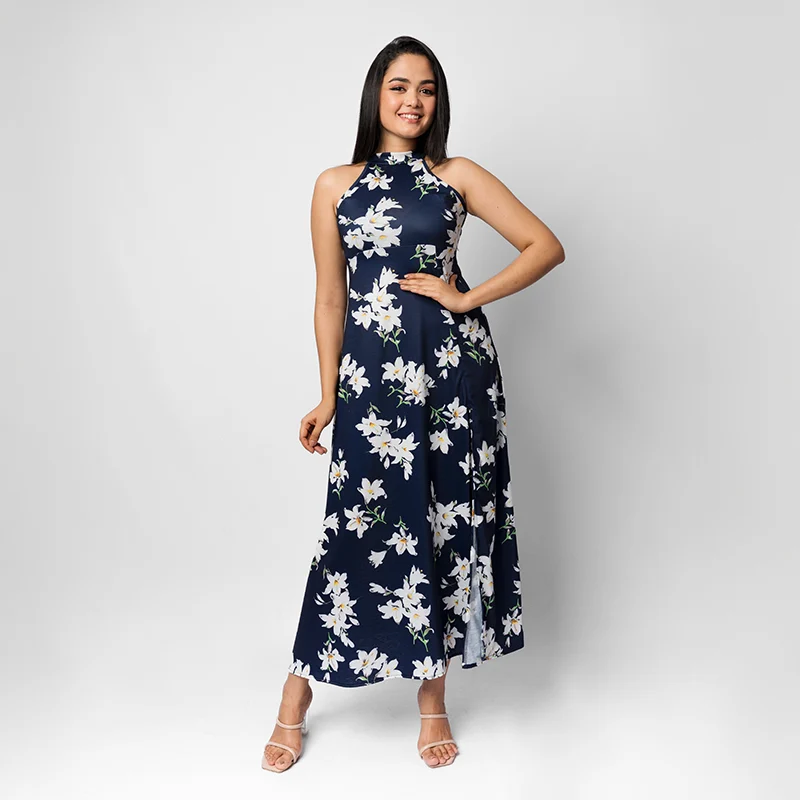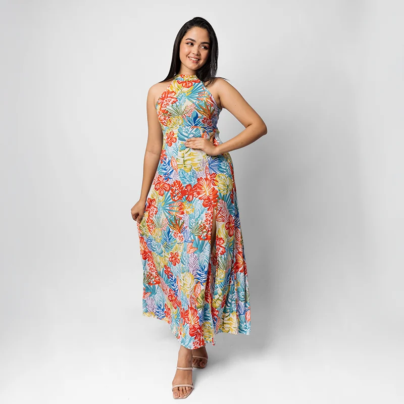 Exude refined elegance in this flowy maxi dress, featuring a chic halter neckline and a flattering A-line silhouette. The side slit adds a graceful touch of movement, blending sophistication with subtle allure. Designed to embrace your shape while offering comfort, this piece is ideal for making a lasting impression.