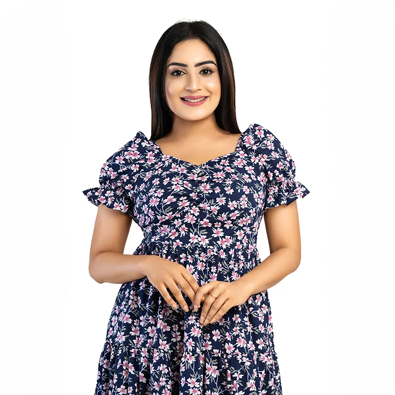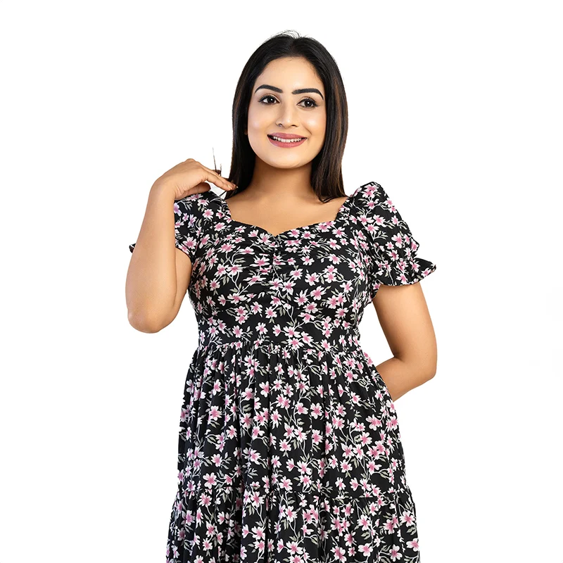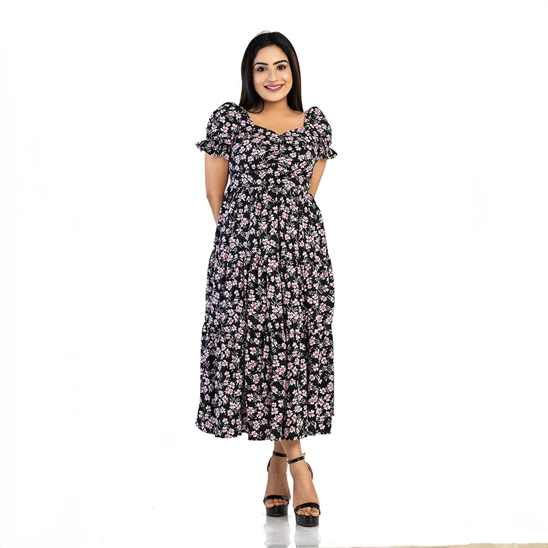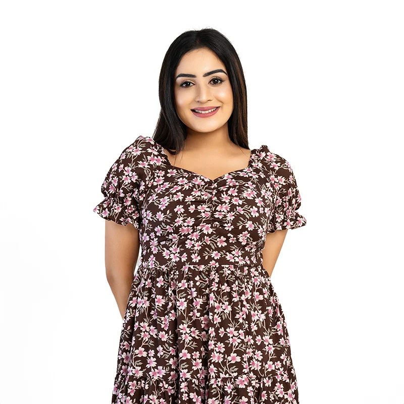 The Lily Puff Sleeve Maxi Dress features a romantic floral print in deep red and white, perfect for any occasion. Its charming puff sleeves and elegant neckline add a touch of whimsy and sophistication. Made from lightweight chiffon, this dress ensures comfort and breathability. The gathered bodice accentuates the waist, flowing into a tiered skirt that sways gracefully. Ideal for both day and evening wear, this dress is a timeless addition to any wardrobe. Available in sizes UK 8-16.