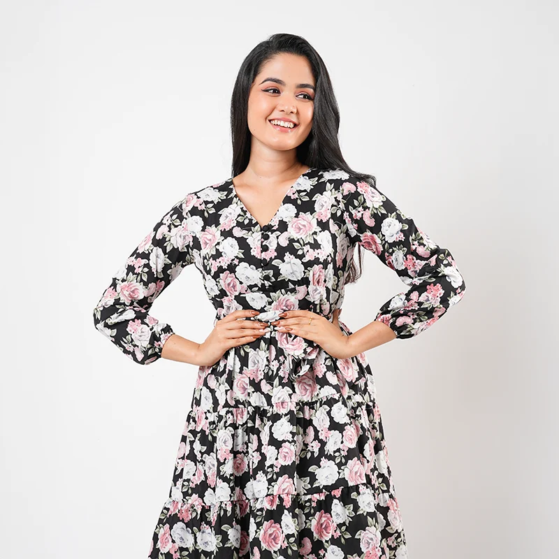 Step into effortless elegance with this beautifully flowing dress designed to move with grace. Featuring a flattering V-neckline, softly gathered waist, and gently flared skirt, this piece creates a balanced silhouette that feels both feminine and comfortable. The long sleeves add a touch of refinement, making it perfect for day-to-evening wear.