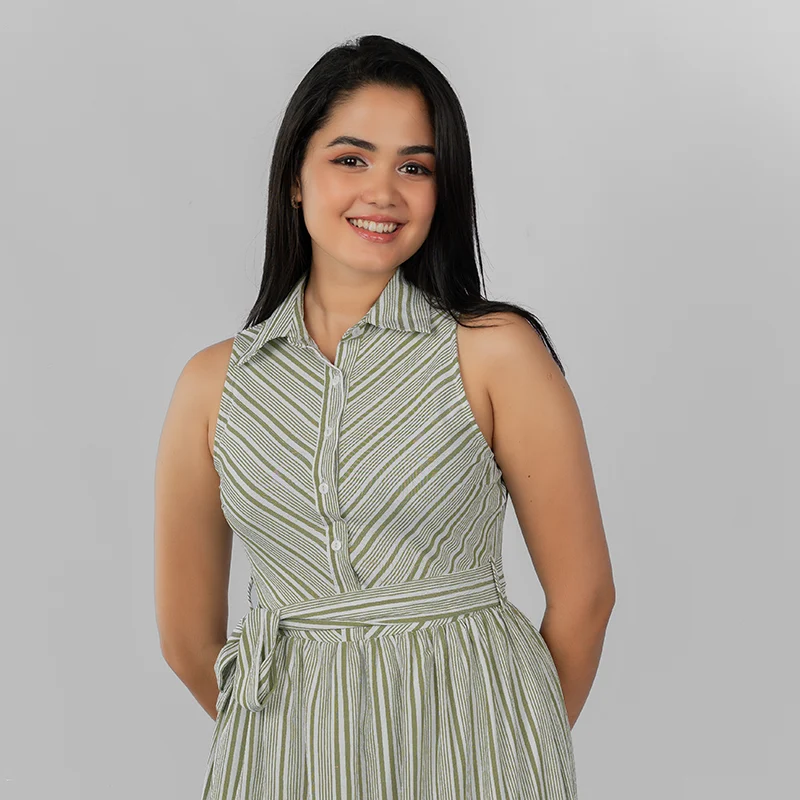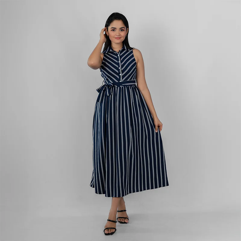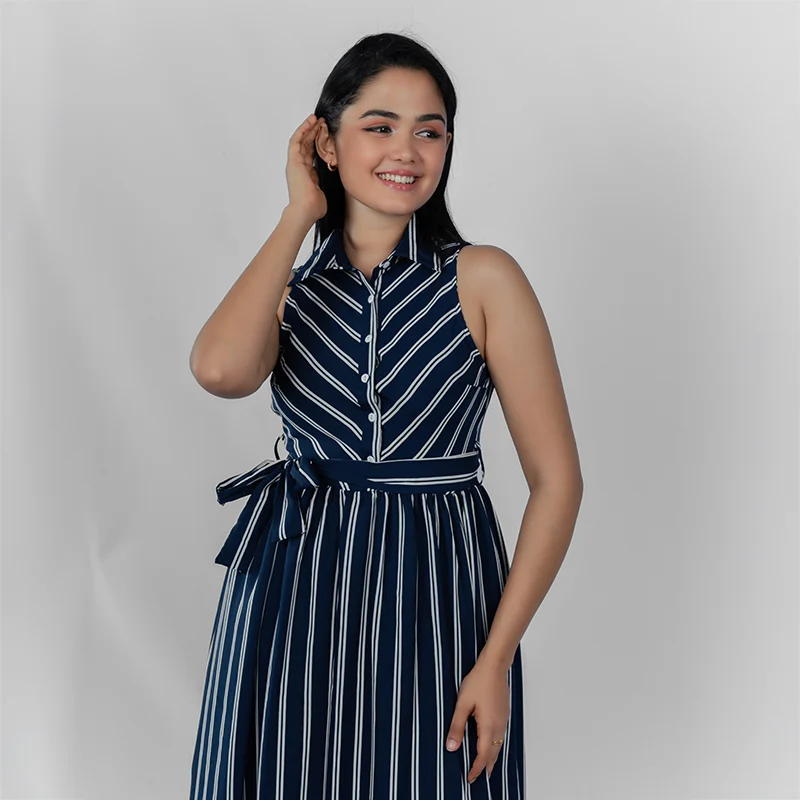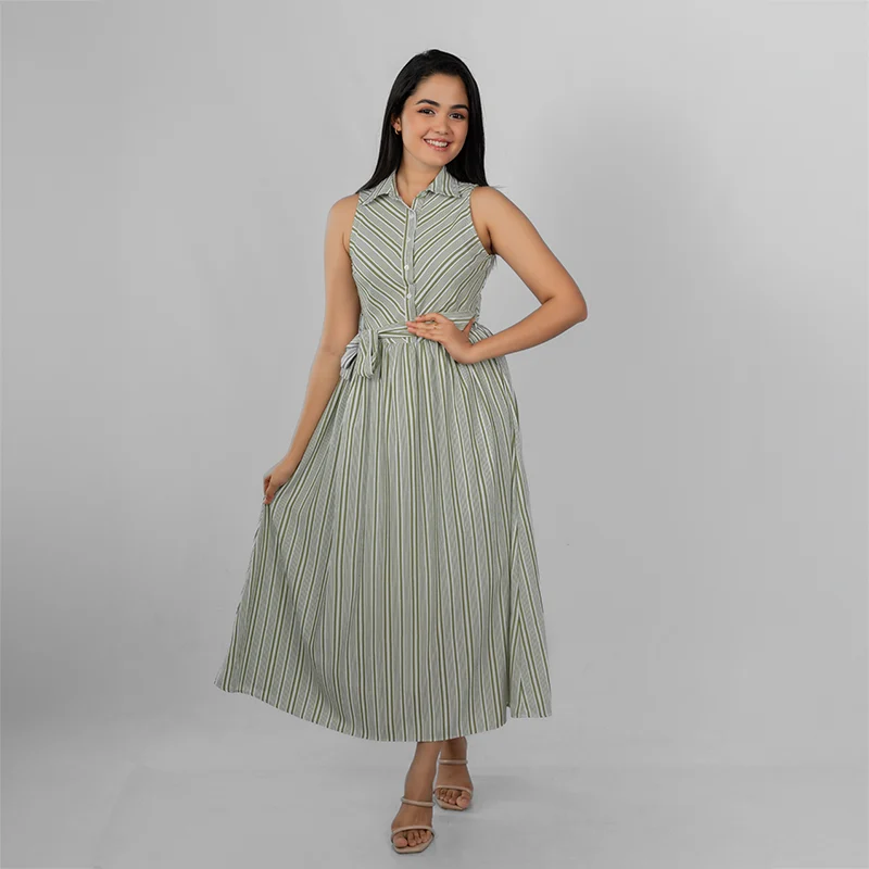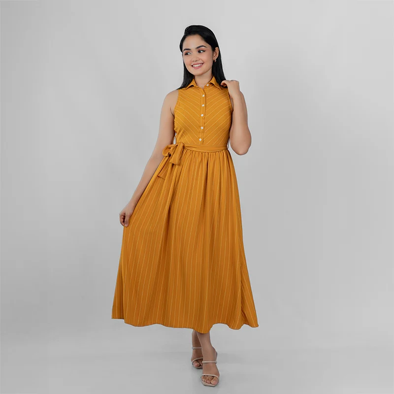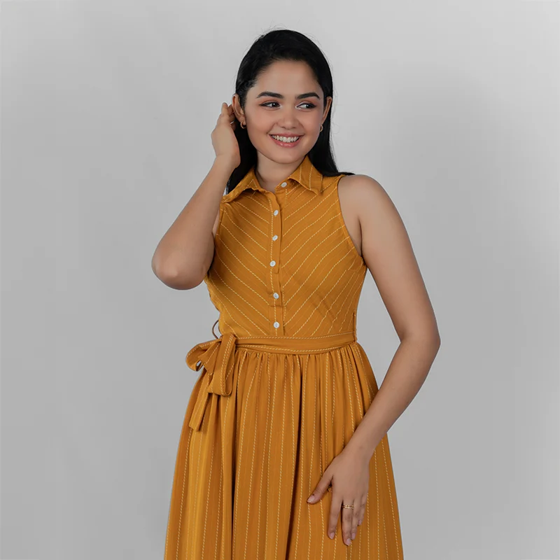 Step into effortless elegance with this refined shirt-style midi dress. Designed with a classic collar and a neat button-down bodice, it creates a polished yet relaxed silhouette. The gently gathered waist is enhanced with a self-tie belt, while the flowing skirt adds graceful movement and timeless femininity.