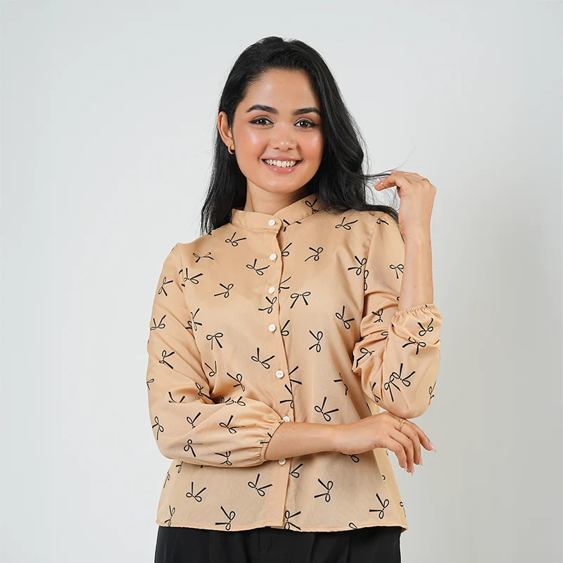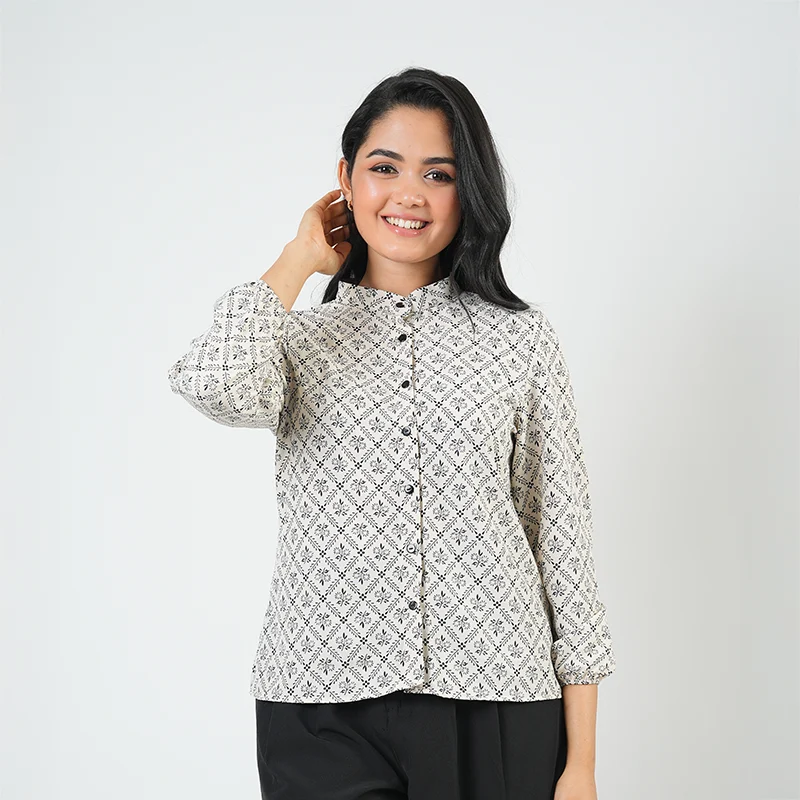 Chic and versatile, this shirt blouse brings a refined charm to your everyday style. Featuring a stand collar, full front button closure, and softly gathered sleeves, it offers a graceful balance between structure and comfort. The subtle geometric print adds a touch of understated sophistication, making it ideal for both professional and casual looks.