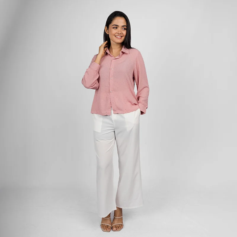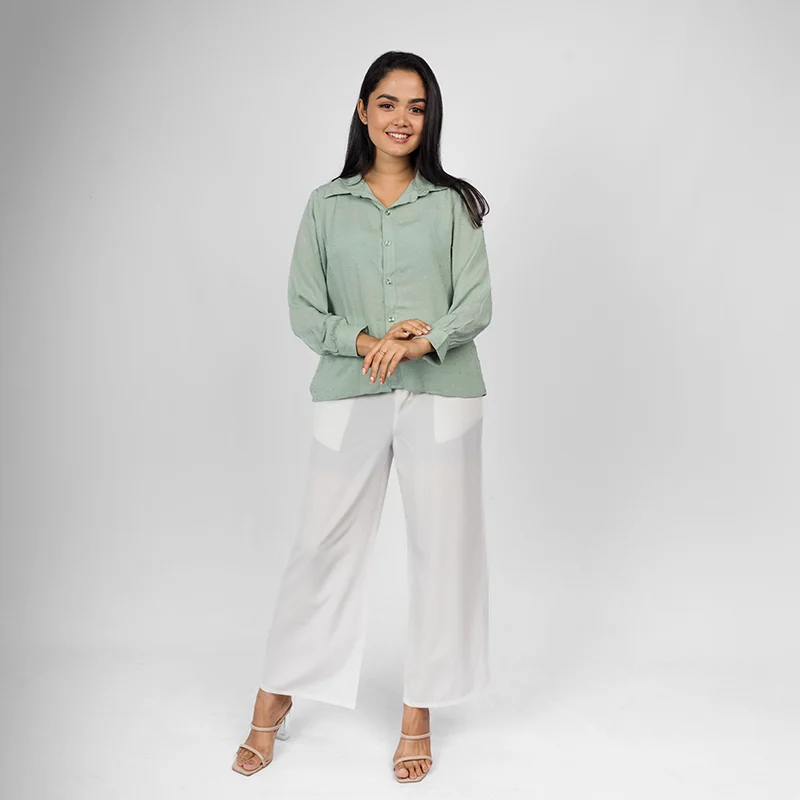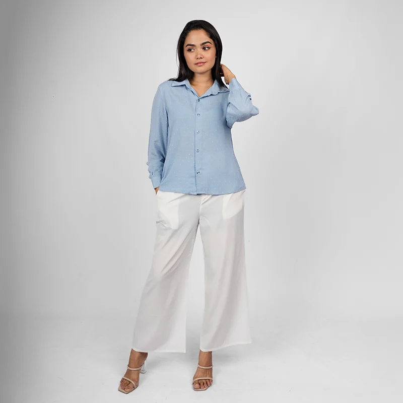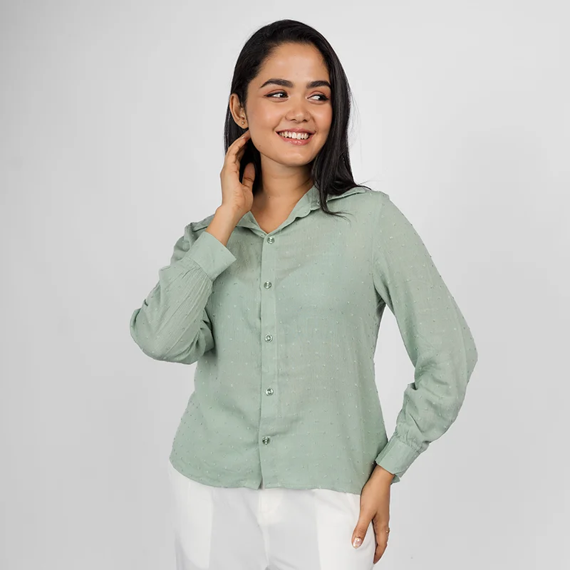 Refined yet relaxed, this button-down blouse embodies effortless sophistication. Designed with full sleeves and a classic collar, it brings a timeless touch to everyday wear. Subtle textured detailing adds depth and charm, while the lightweight cotton fabric ensures all-day comfort and breathability.