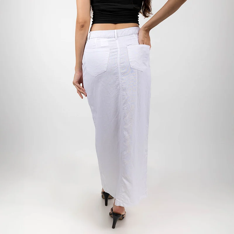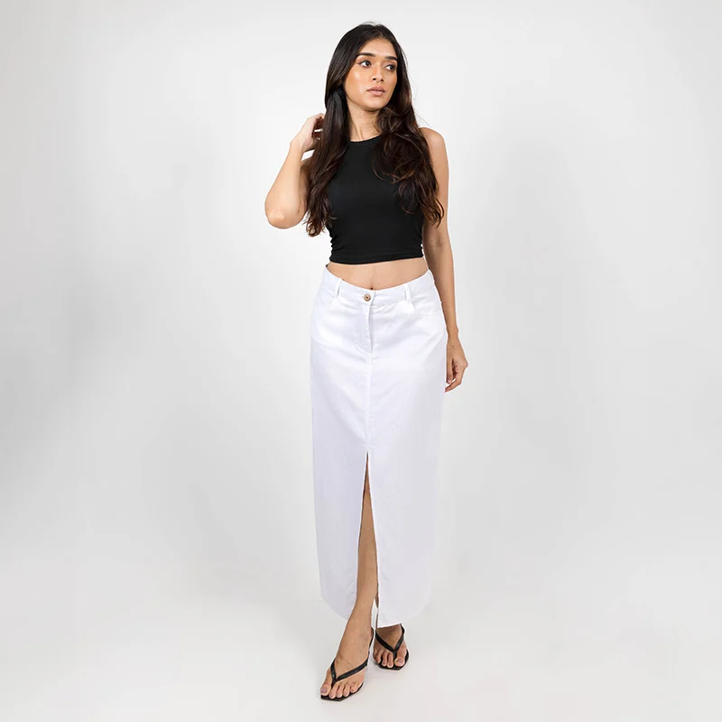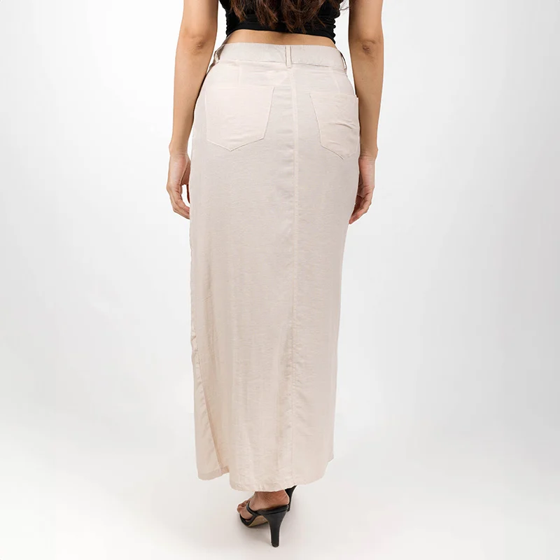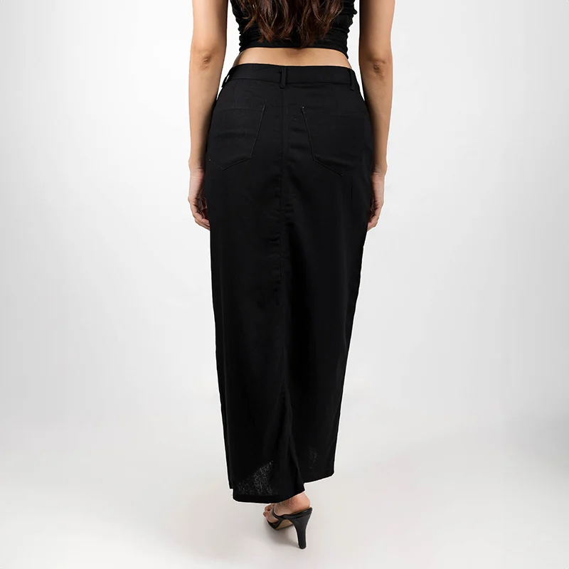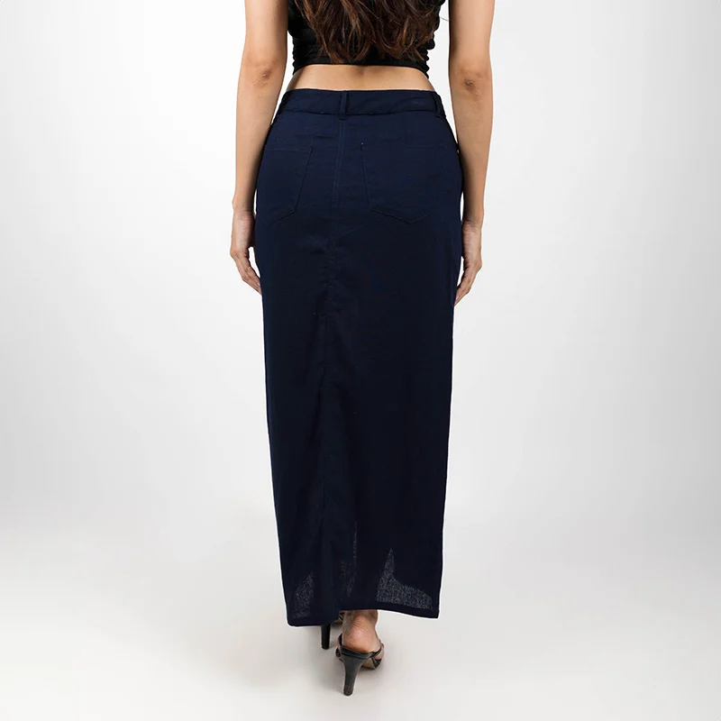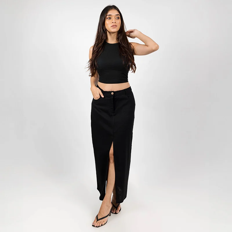 Effortlessly chic, this minimalist high-slit skirt set redefines elegance with its high-waisted design and refined front slit. Crafted from breathable, lightweight linen, the skirt offers a tailored fit that flatters your silhouette, while practical pockets and a button-zip closure add functionality. Perfect for casual lunches, office days, or evening outings, this versatile piece pairs seamlessly with crop tops, blouses, or flowy shirts. Style it with delicate jewelry, strappy sandals, or block heels for a polished look that transitions effortlessly from day to night.