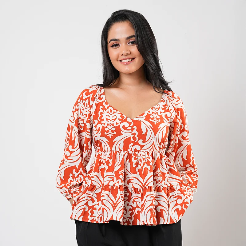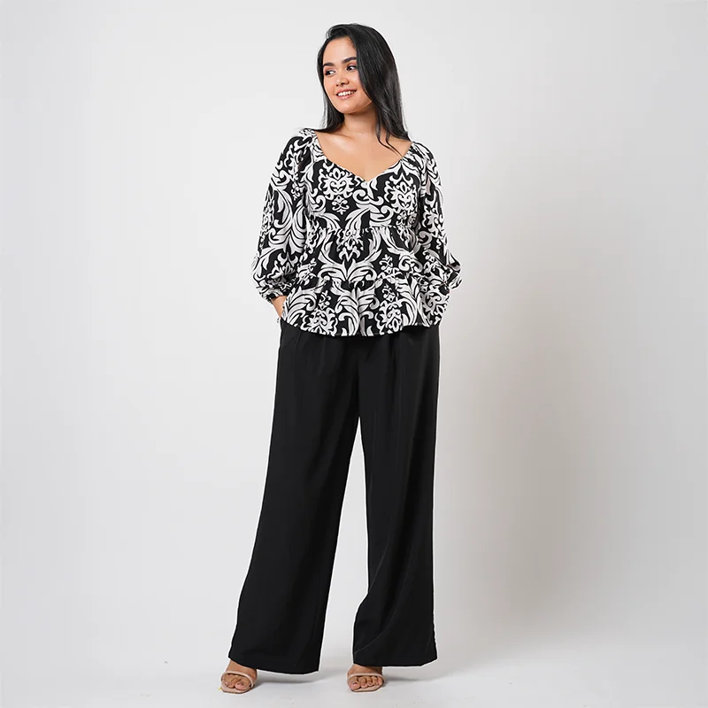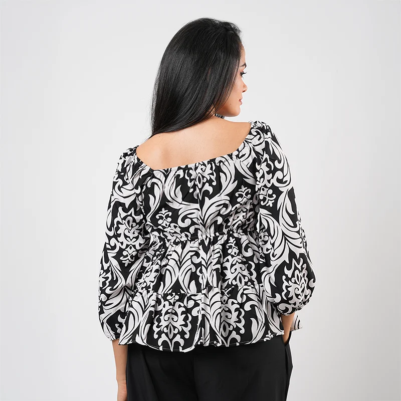 Add a touch of effortless charm to your wardrobe with this beautifully structured peplum blouse. Designed with a softly contoured neckline, voluminous sleeves, and a gathered waistline, it creates a flattering silhouette while offering all-day comfort. The flowy layered finish adds movement and elegance, making it a standout everyday piece.