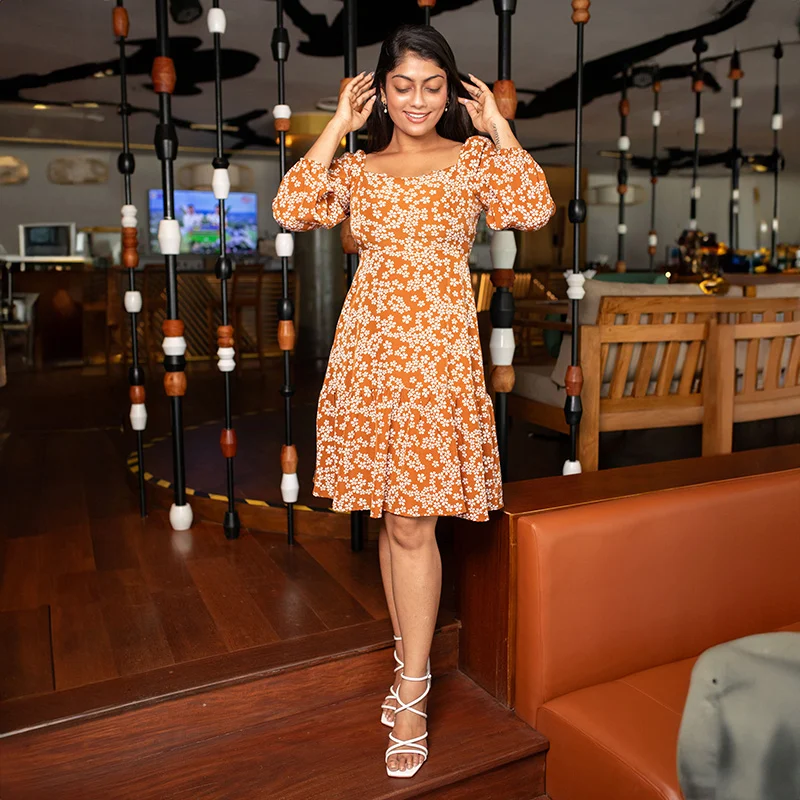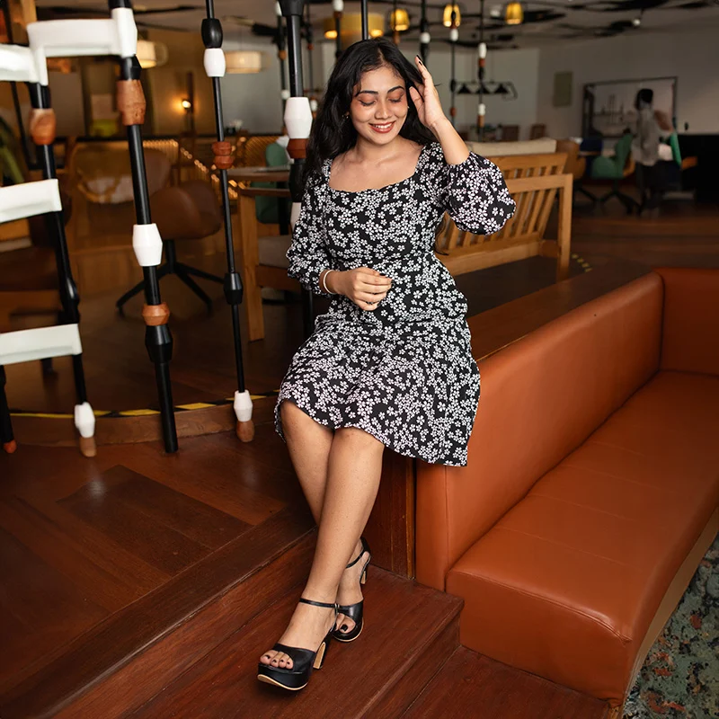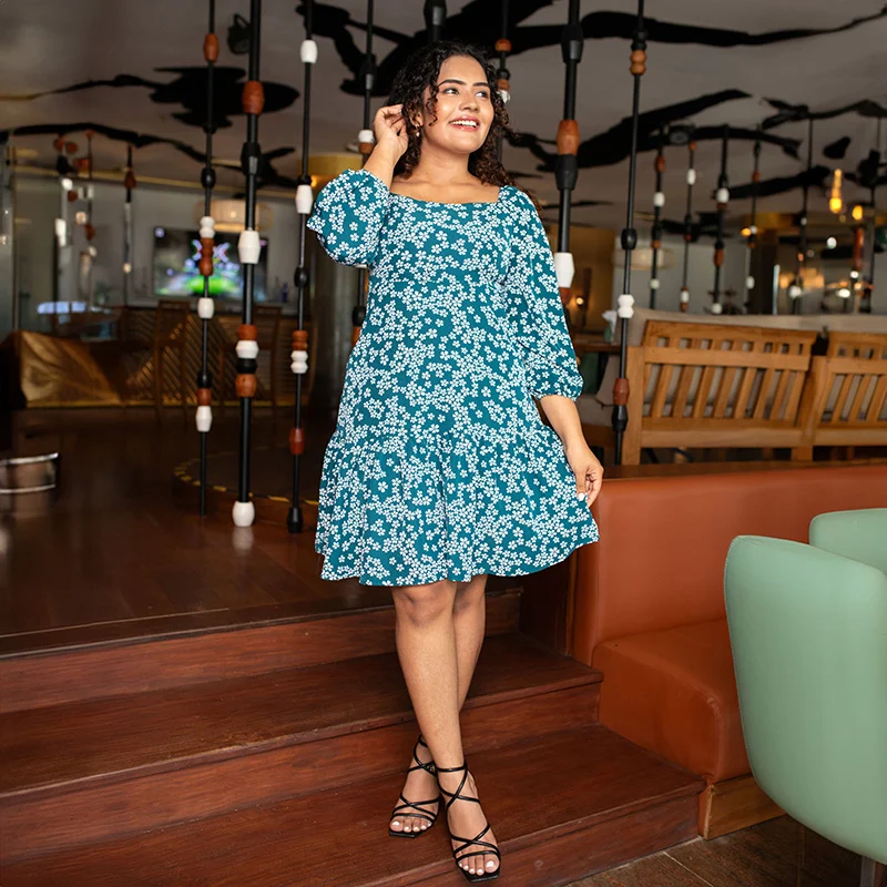 The Nicole Mini Dress in a vibrant teal hue features a charming floral pattern, a square neckline, and three-quarter puff sleeves for a touch of elegance. The fitted bodice cinches at the waist, flowing into a tiered skirt that falls just above the knees, offering a comfortable and flattering fit. Perfect for any occasion, this dress pairs effortlessly with strappy sandals or block heels. Its lightweight, breathable Maza fabric ensures all-day comfort, making it a must-have addition to your wardrobe.