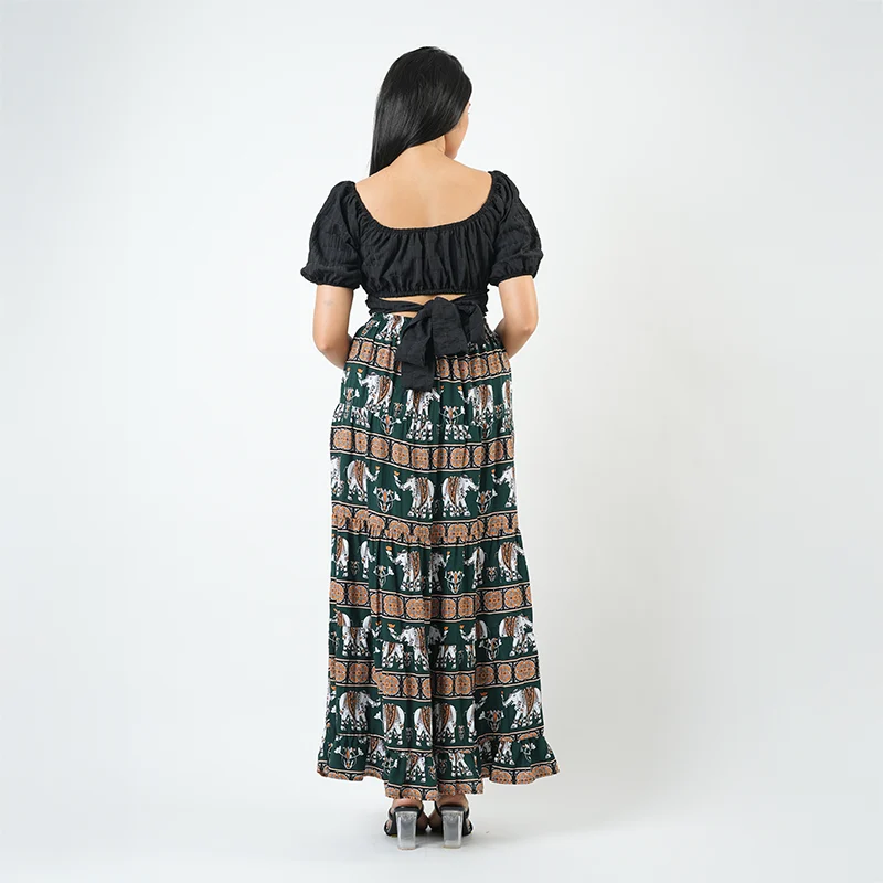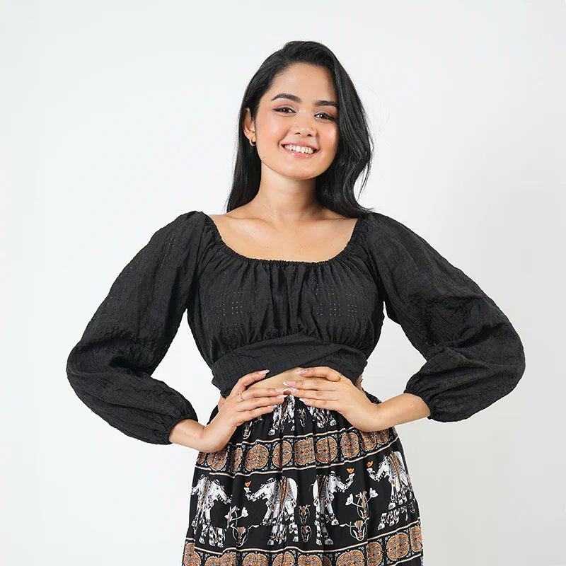 Step into effortless sophistication with this beautifully coordinated two-piece set that blends modern style with a hint of boho charm. The cropped top features a flattering square neckline and gathered detailing, complemented by softly puffed sleeves for an elegant silhouette. The flowy high-slit skirt adds movement and allure, creating a perfectly balanced look that’s both relaxed and refined.
