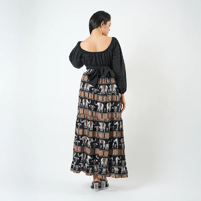 The top is tailored from soft, breathable cotton flex, offering lightweight comfort with a structured finish. The skirt, crafted from smooth revon fabric, drapes gracefully to enhance its fluid form and intricate design.